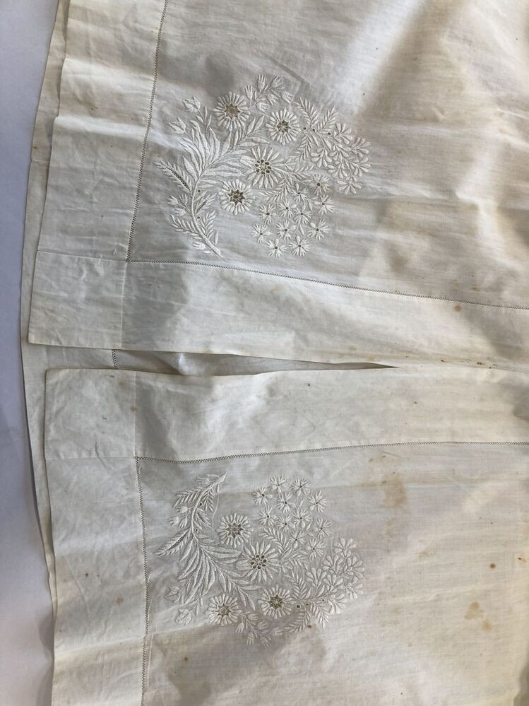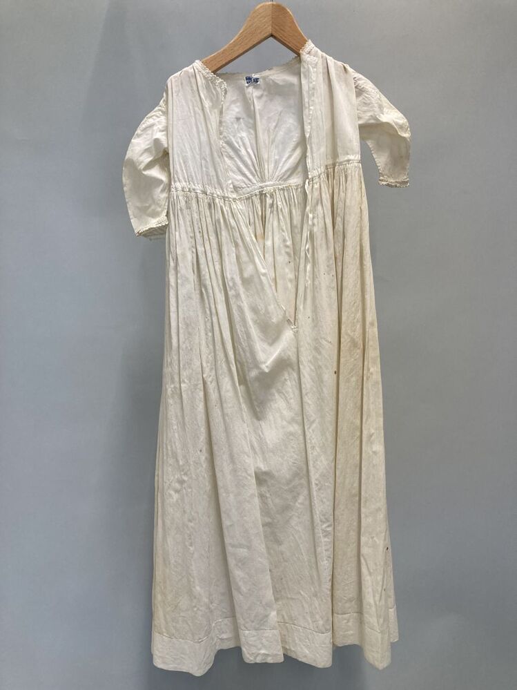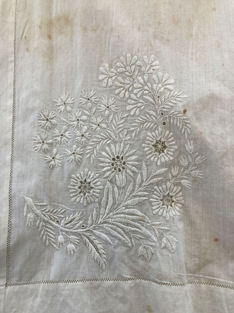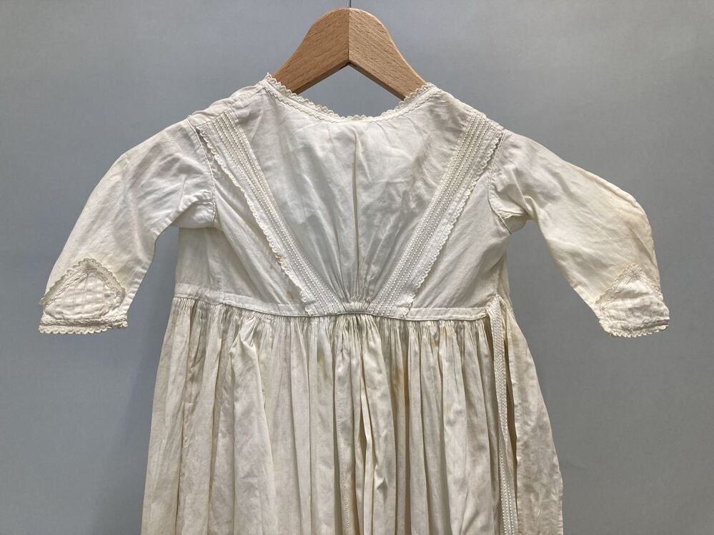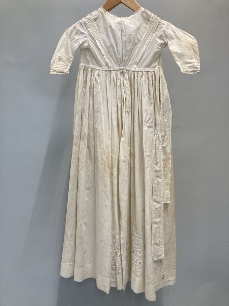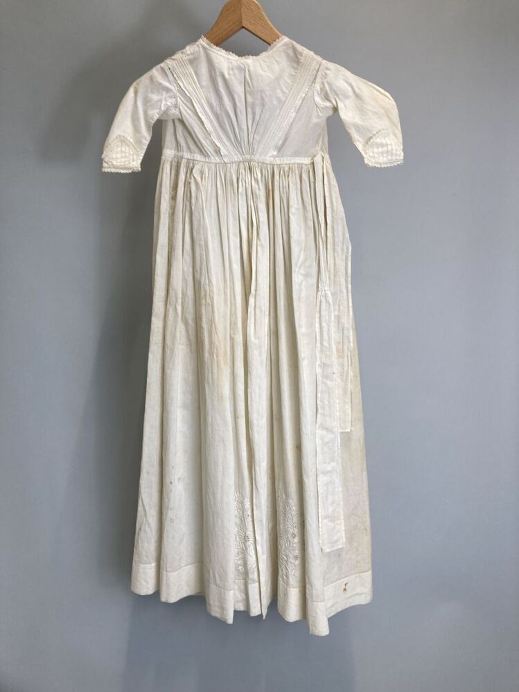 Doopjurk van wit katoen, broderie bouquetten, open naaiwerk en broderie strook