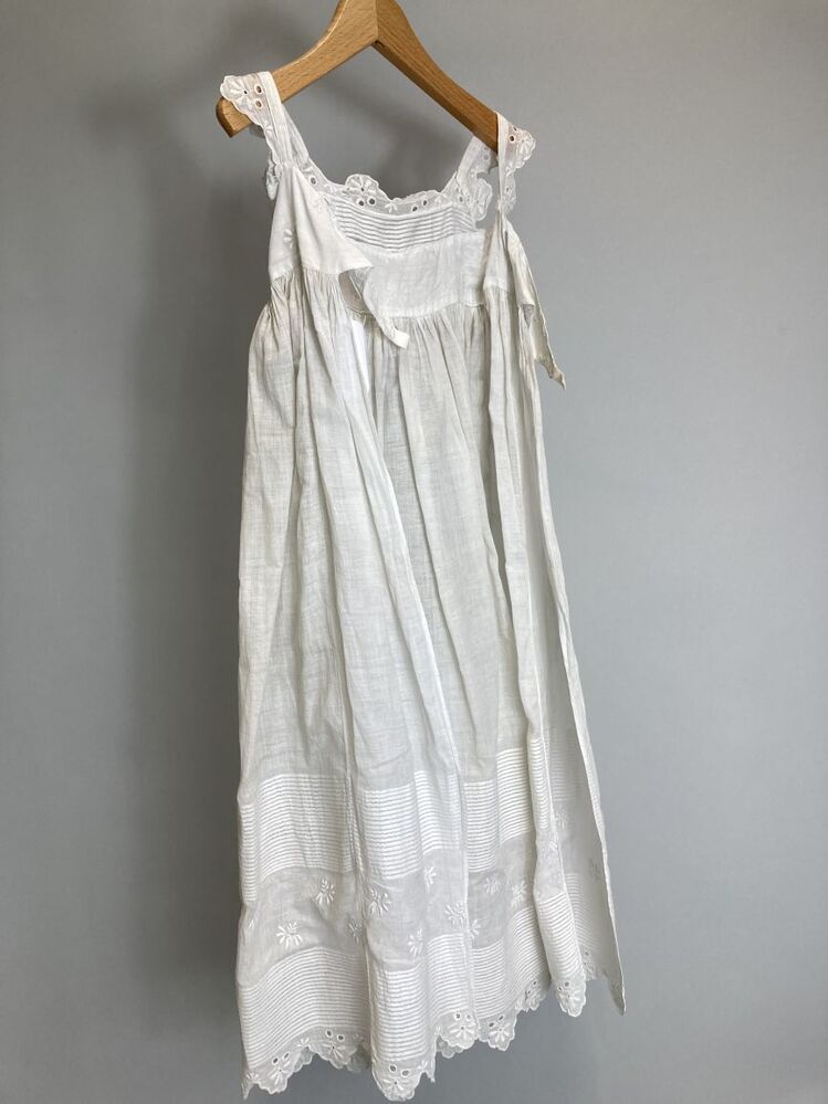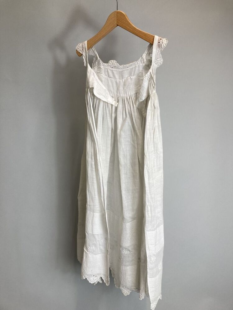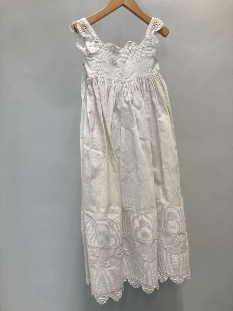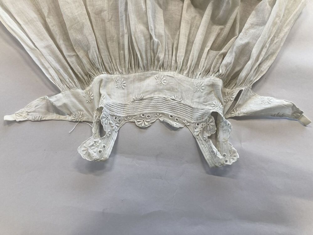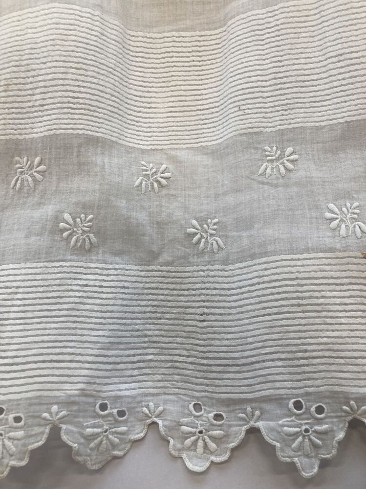 Doopschort of overgooier van wit batist met ingeweven streep en geborduurde bloemmotiefjes.