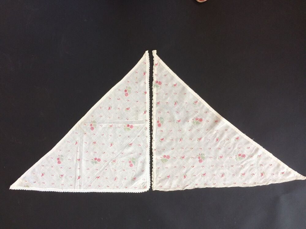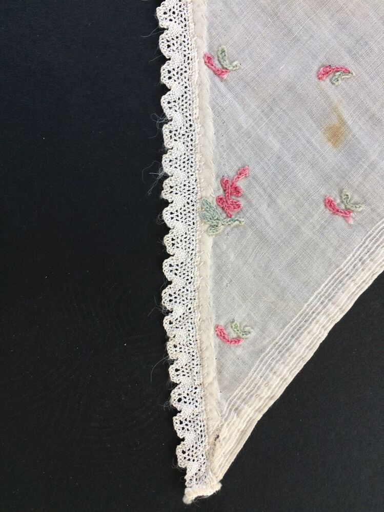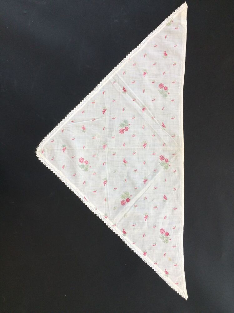 Fichu van wit batist met tamboereerwerk in rood en groen, zes bloemmotiefjes en strooimotiefjes en aan de korte zijden een smal kloskantje