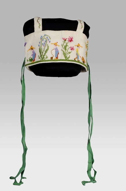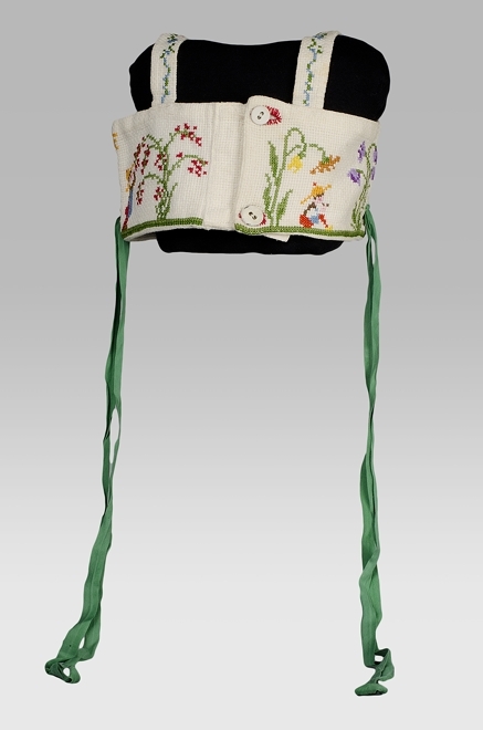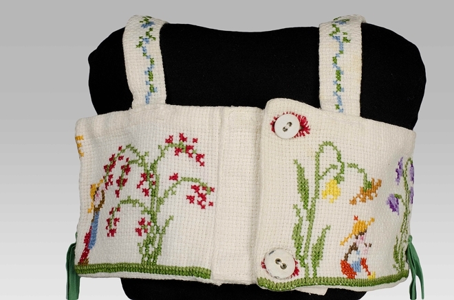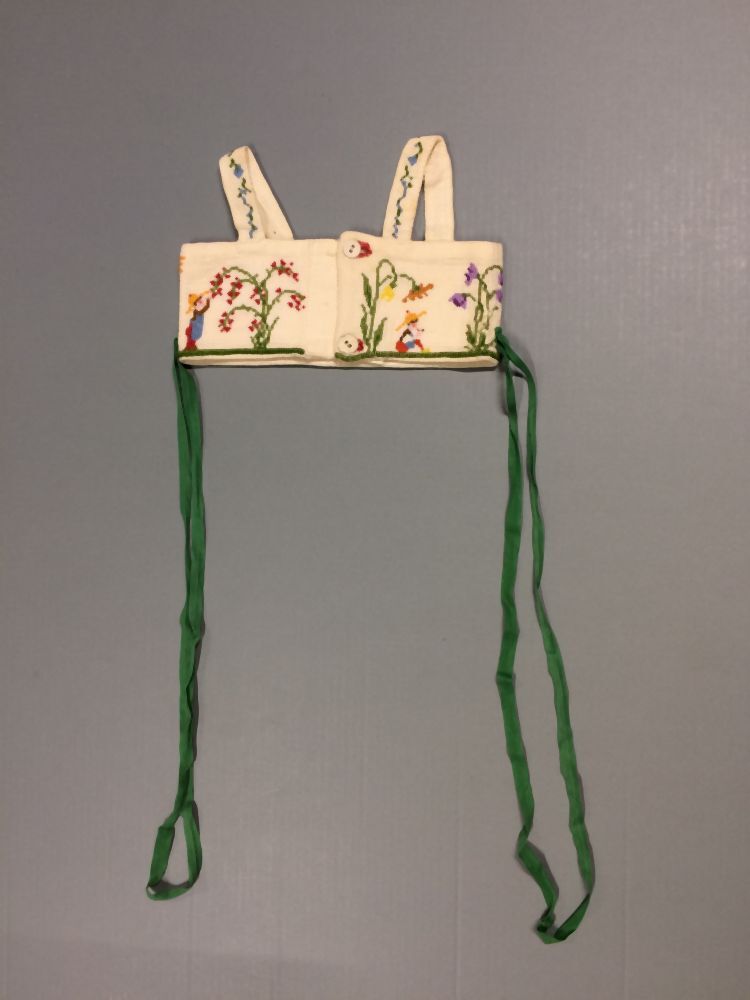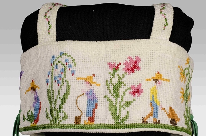 Tuigje van wit katoenen wafelstof, kruissteek borduursel, vijf tuinmannetjes bij grotere bloemplanten