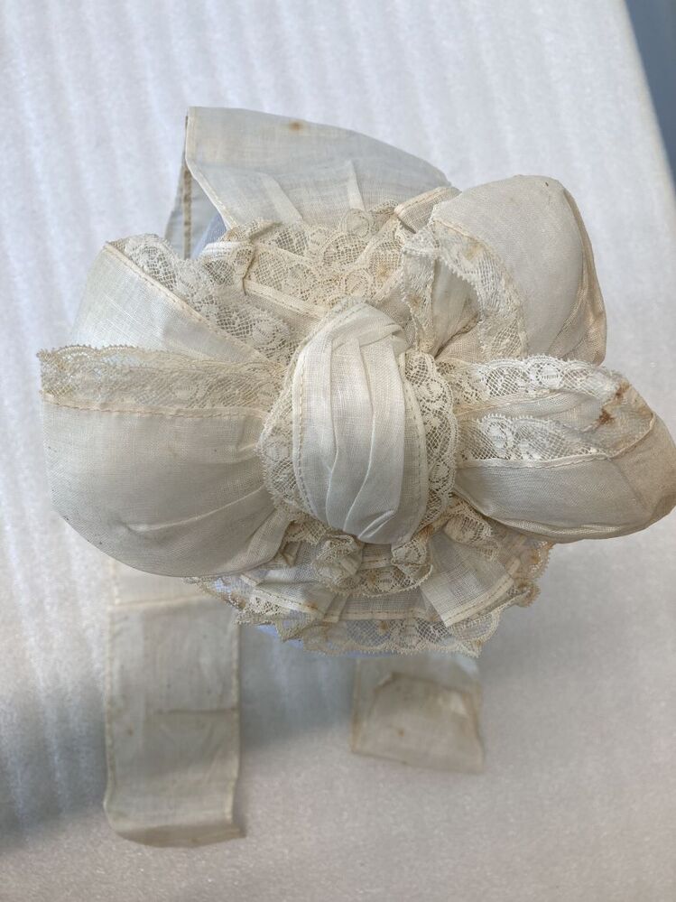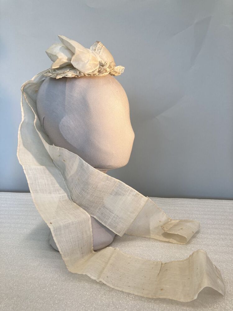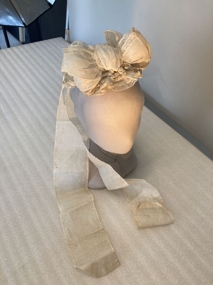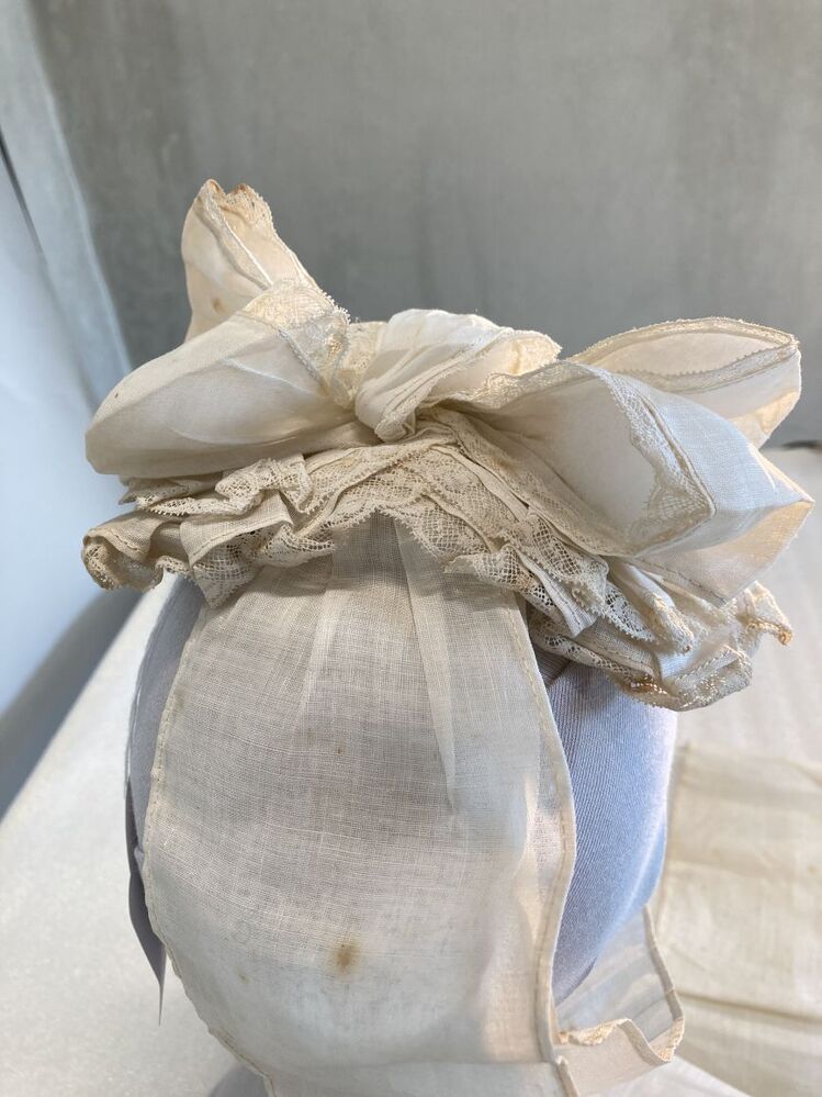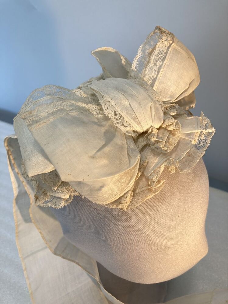 Dienstbodenkapje met strik en slippen, afgezet met met wit machinaal kant