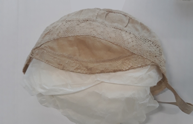 kindermuts van wit linnen met Hollandse kloskant