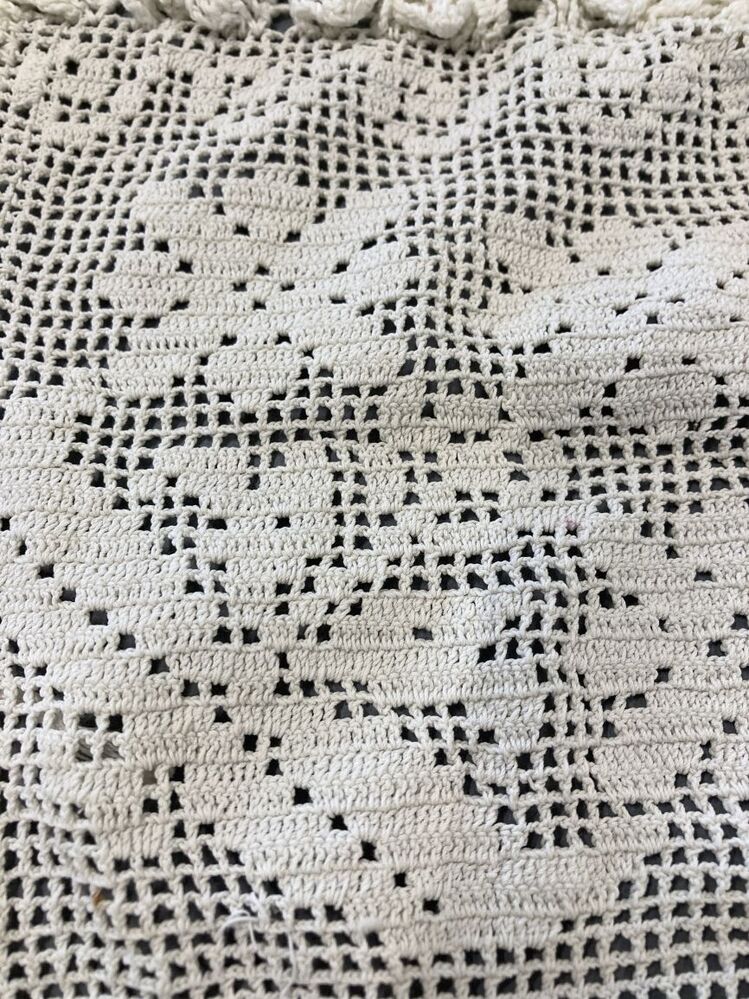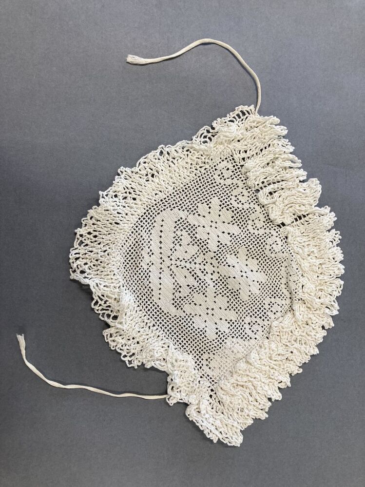 Morgenmuts van haakwerk met bloempotmotief in de bol en hanekam.