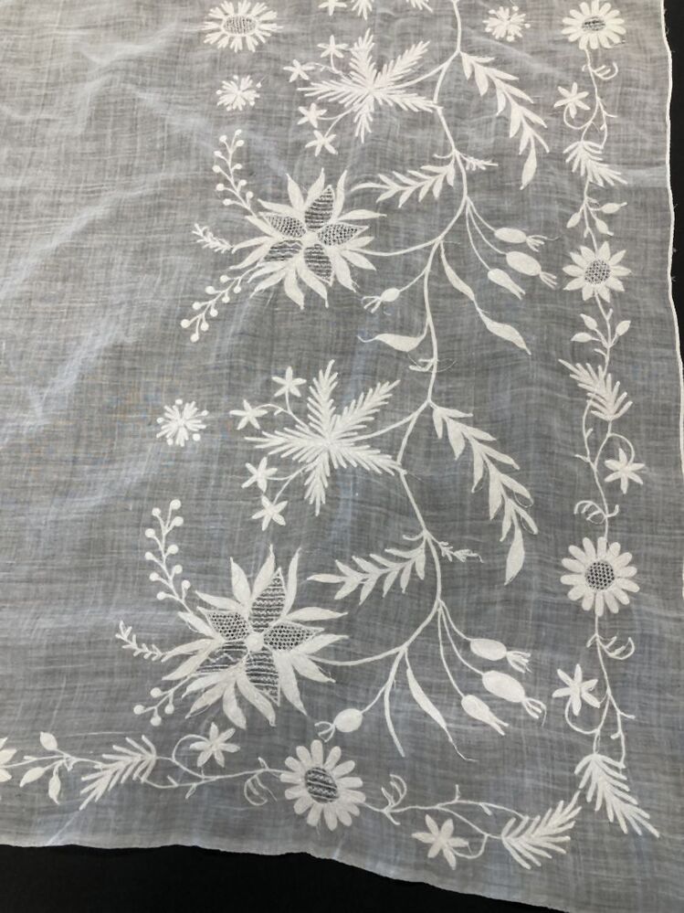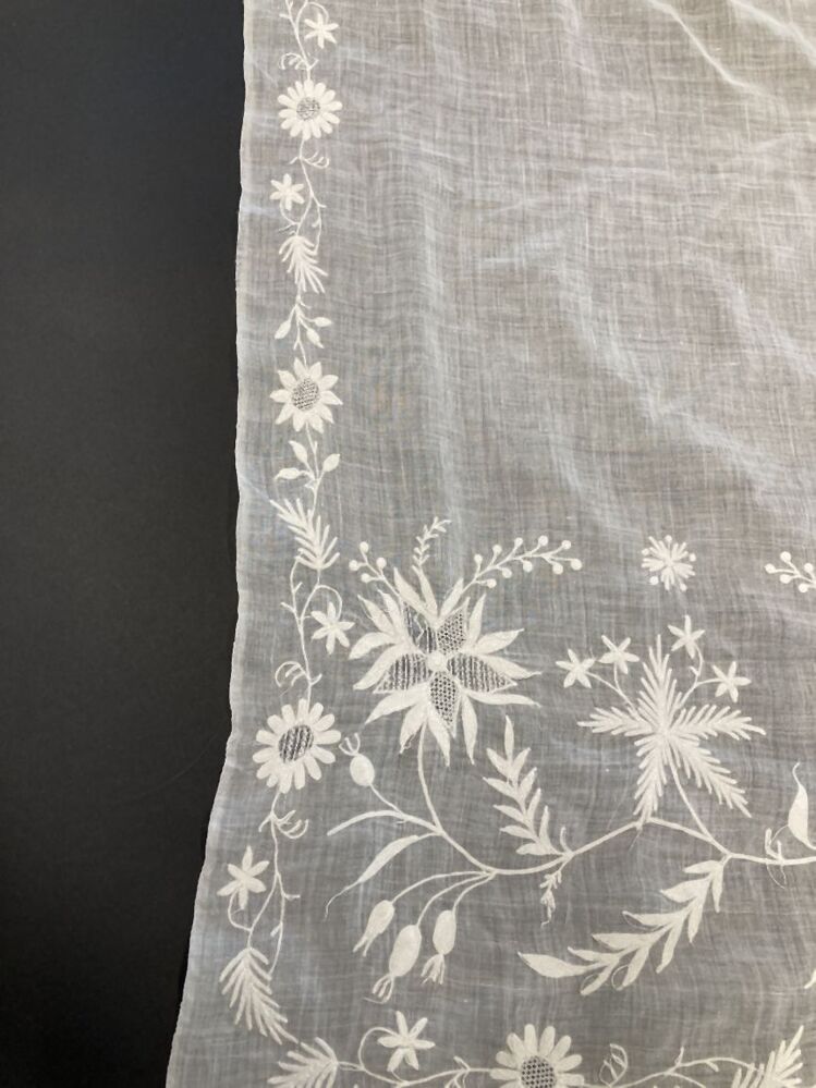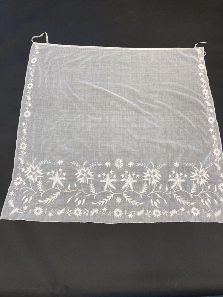 Neteldoek schort met bloemranken in tamboereerwerk en perzisch ajour