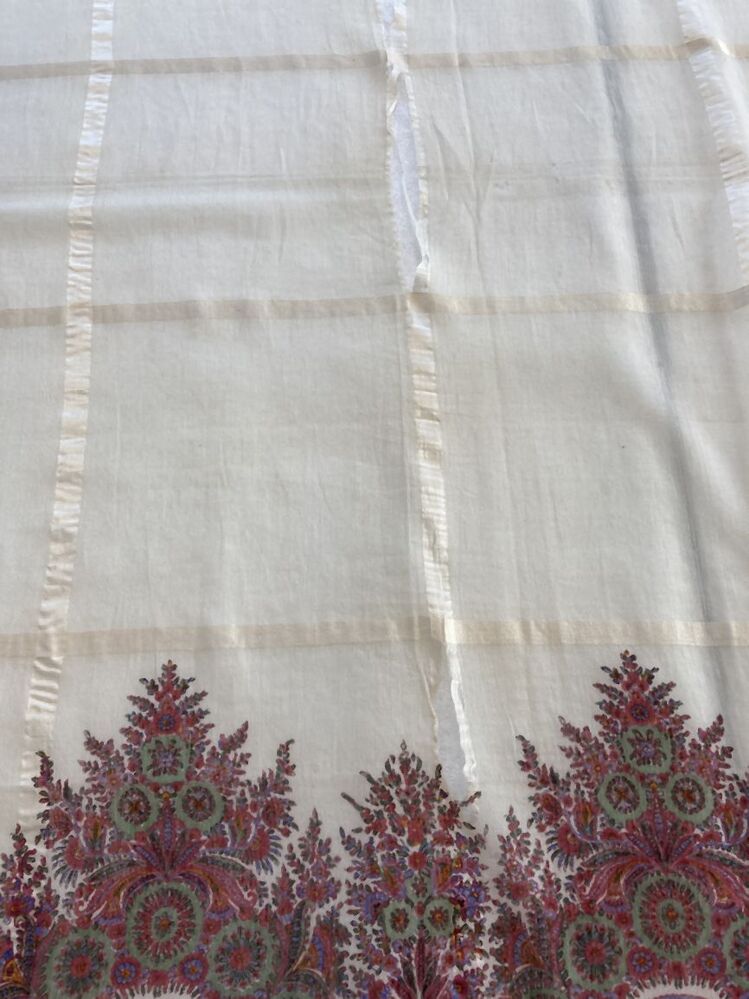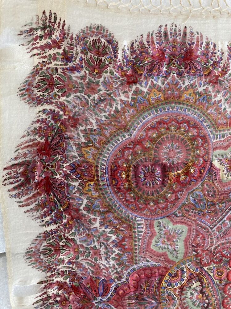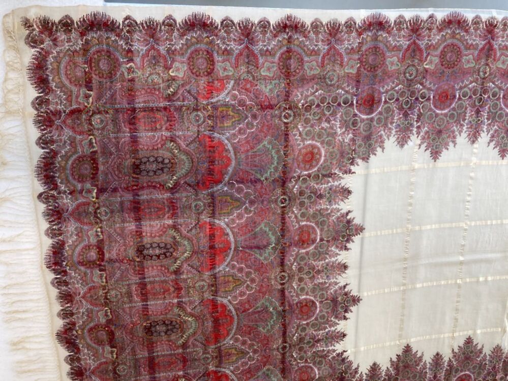 Omslagdoek van dunne witte wollen mousseline met zijden ruiten, bedrukt met kasjmierpatroon, met aangeknoopte franje