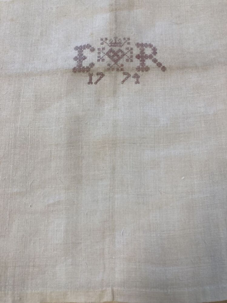 Wit linnen peluwlaken met roze zijden monogram borduursel ER 1774