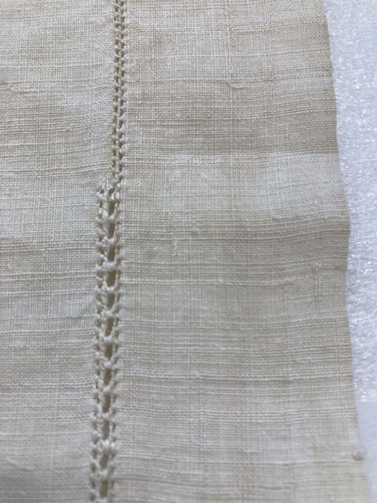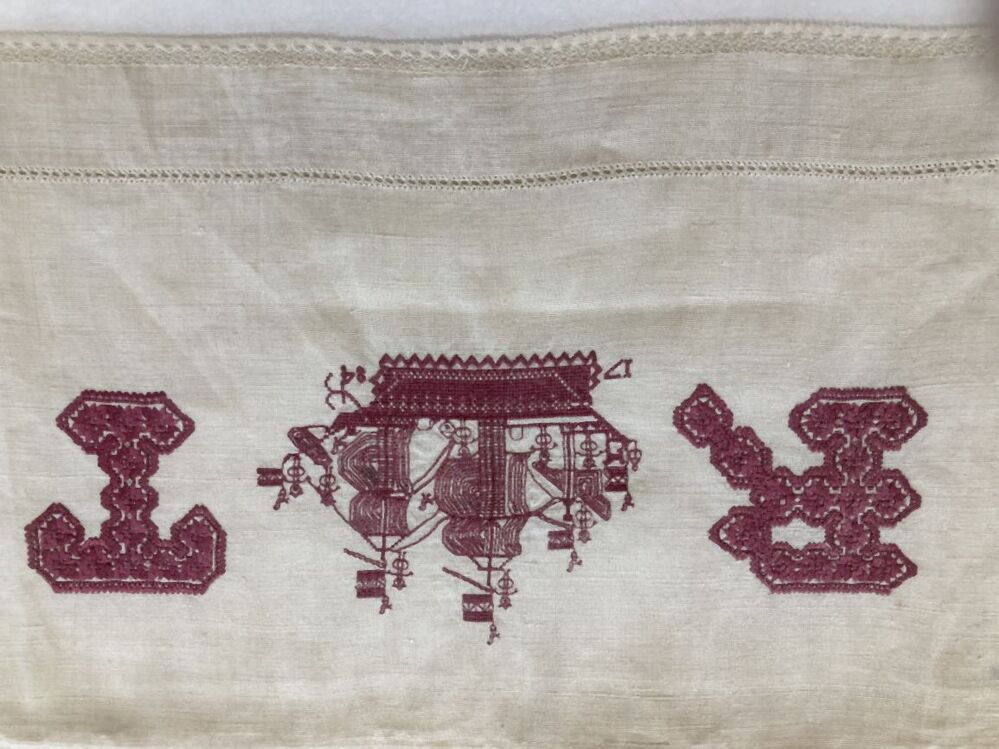 Wit linnen wiegenlakentje met roze zijden borduursel RT 1784 en driemaster, afgezet met Torchon kantje