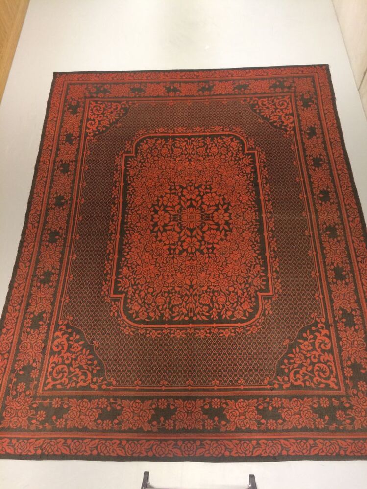 Wollen vloertapijt, platbinding in rood met zwart, gestilleerd bloempatroon, rondom diverse randen