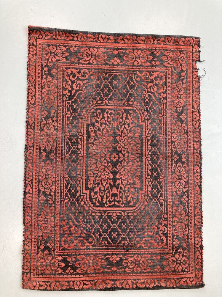 Vloertapijt geweven van zwarte en rode wol, rechthoekig floraal motief in het midden, eromheen diverse randen