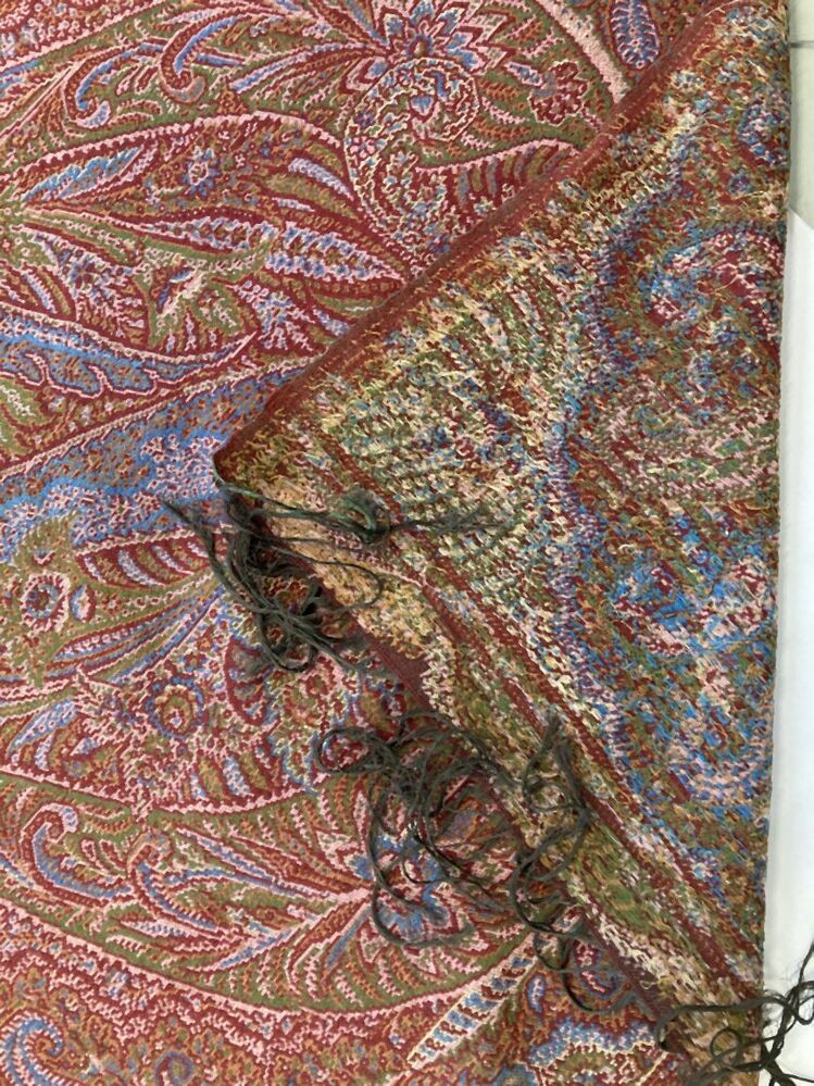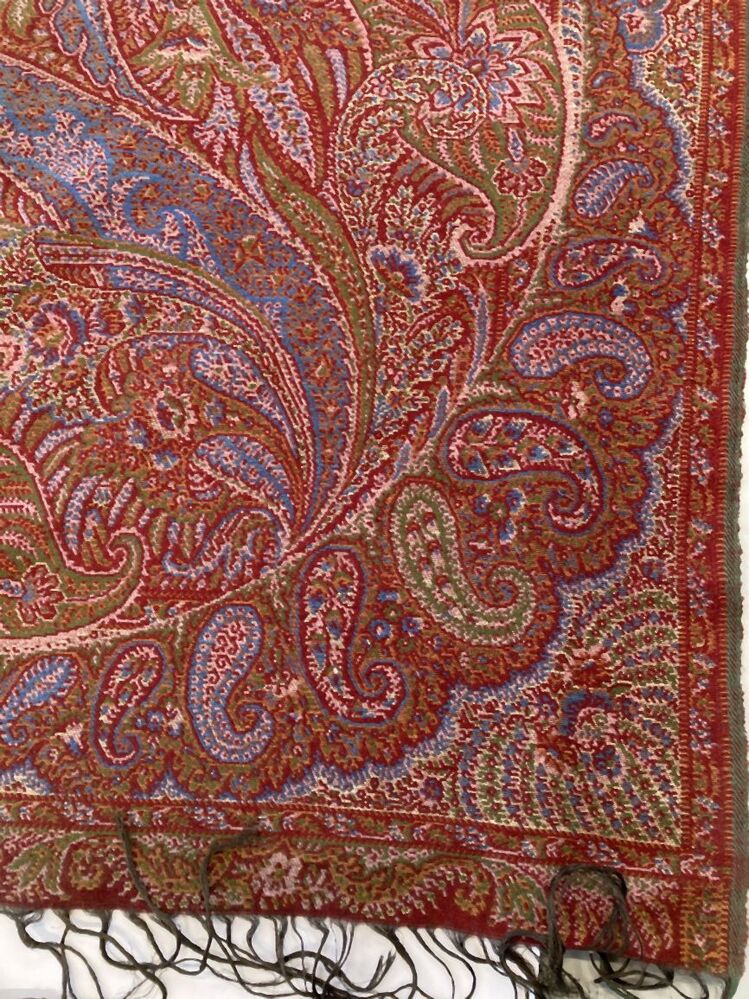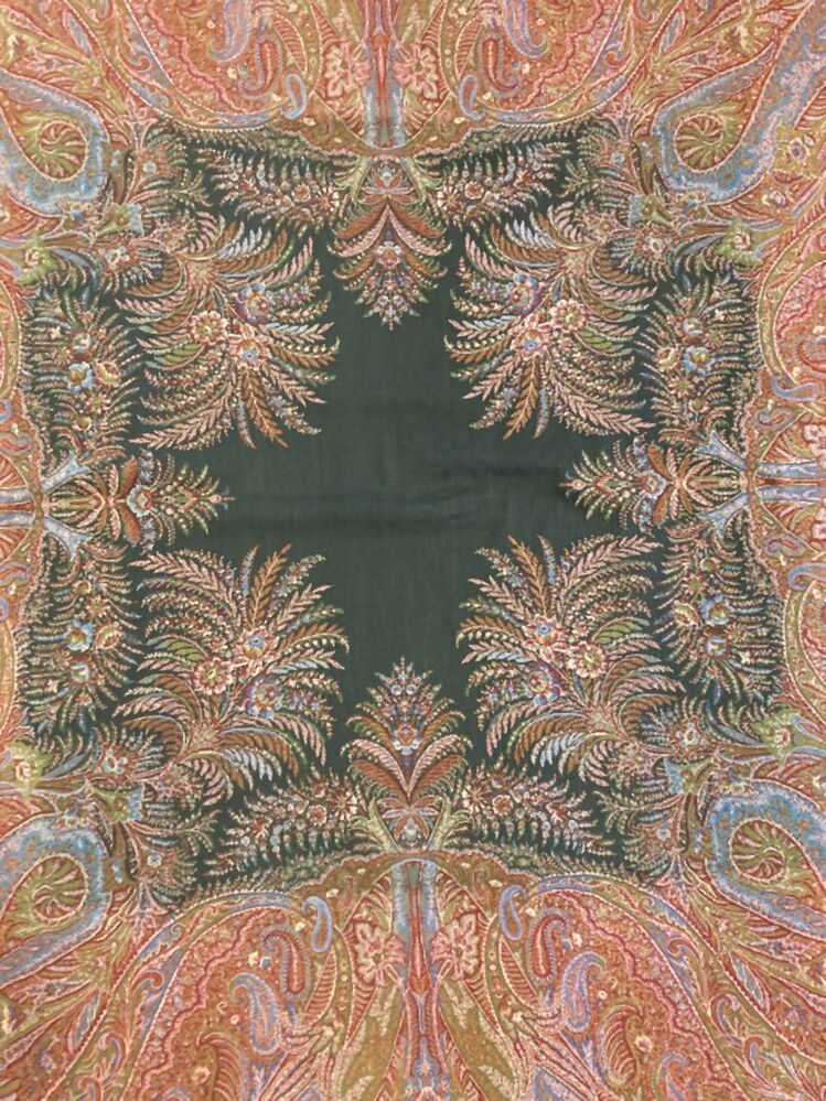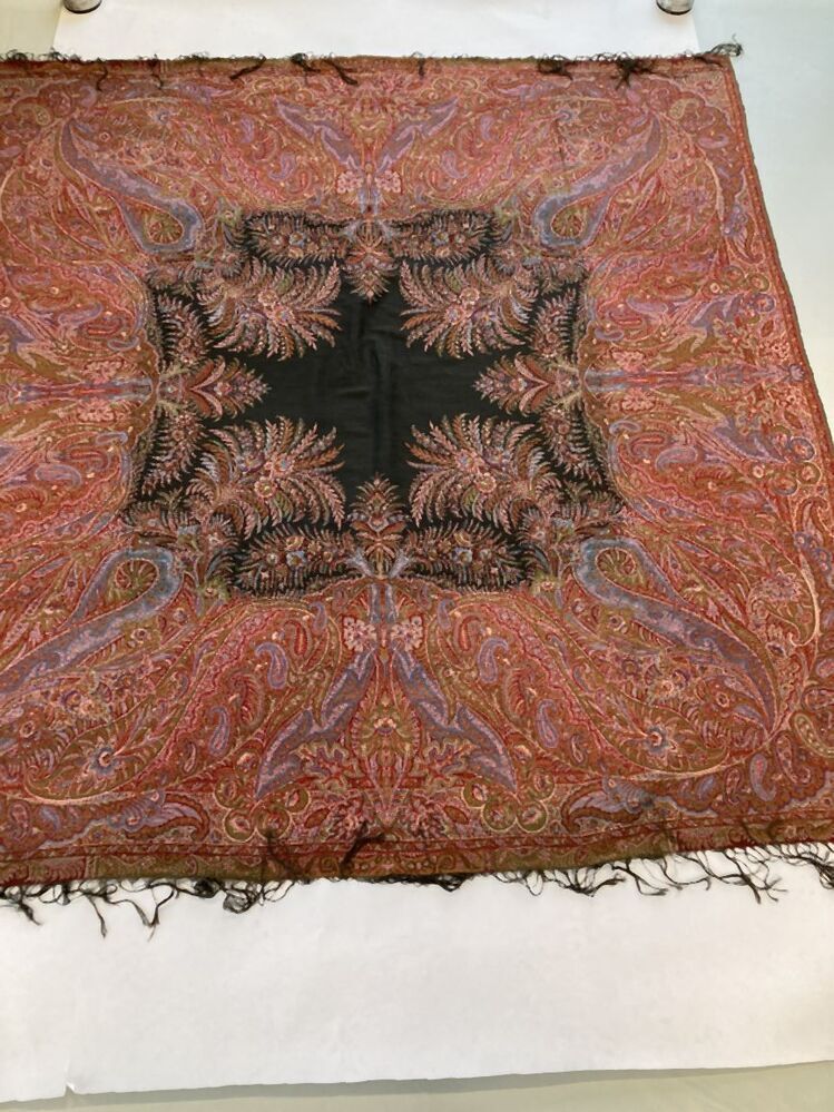 Europese kasjmier omslagdoek met vloeiende kasjmierpatronen in de rand en boeketten in het zwarte middenveld