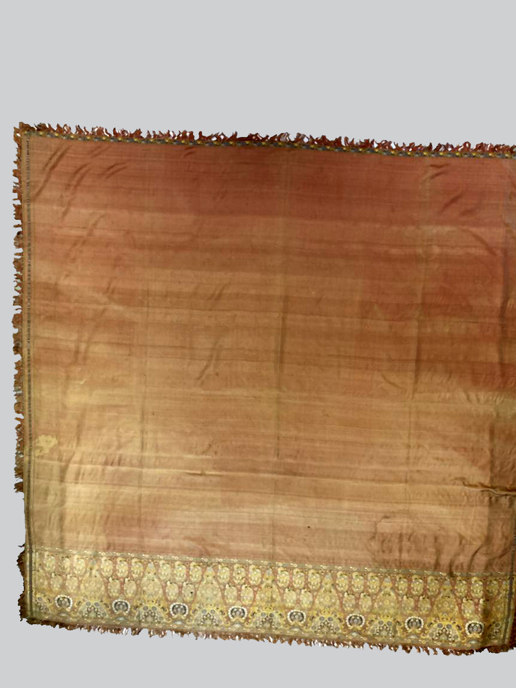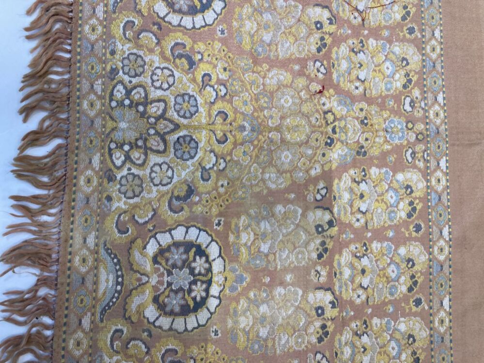 Omslagdoek van zalmroze keper-zijde met aan één zijde een ingeweven rand met kasjmier patroon