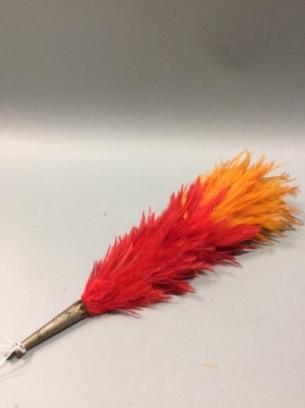 Pluim van oranje en rode veren in metalen houder