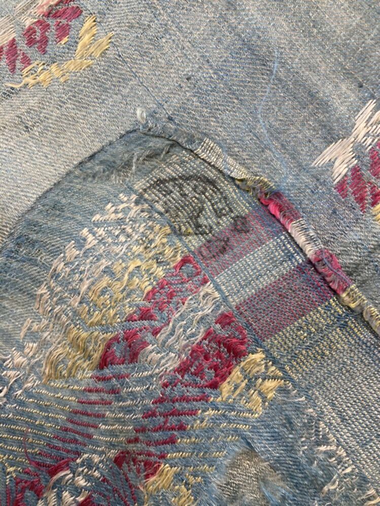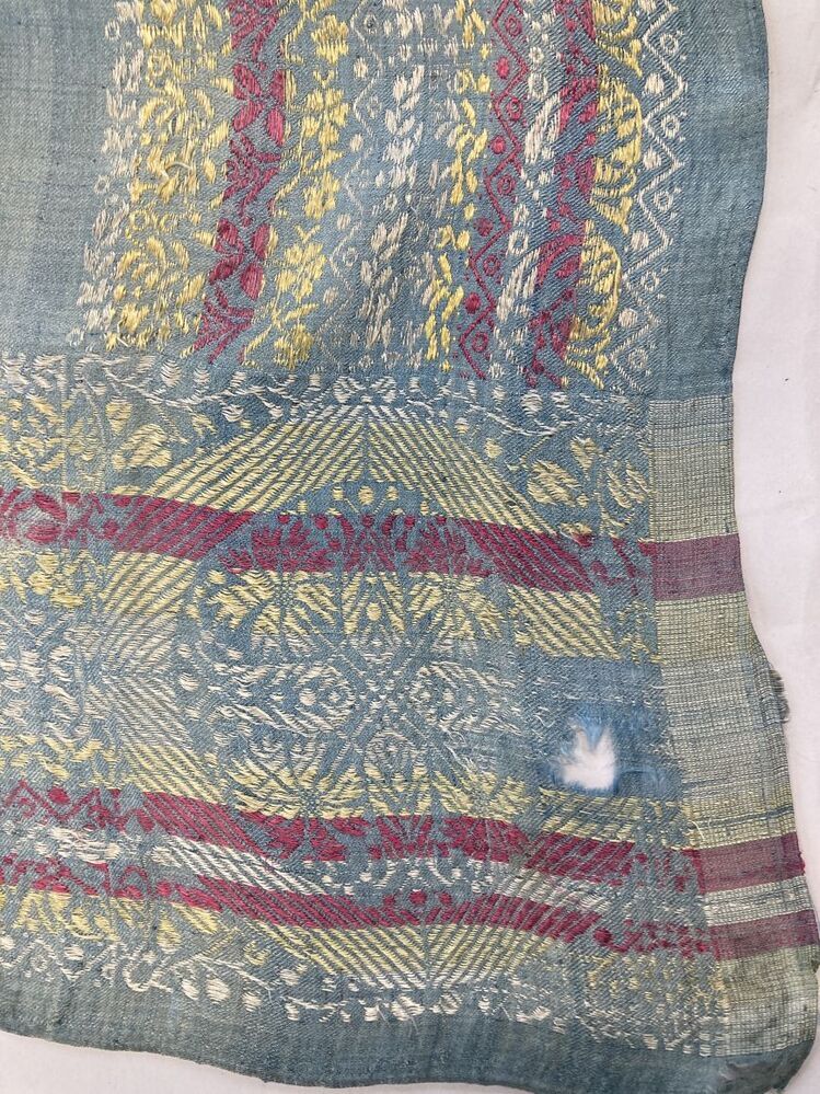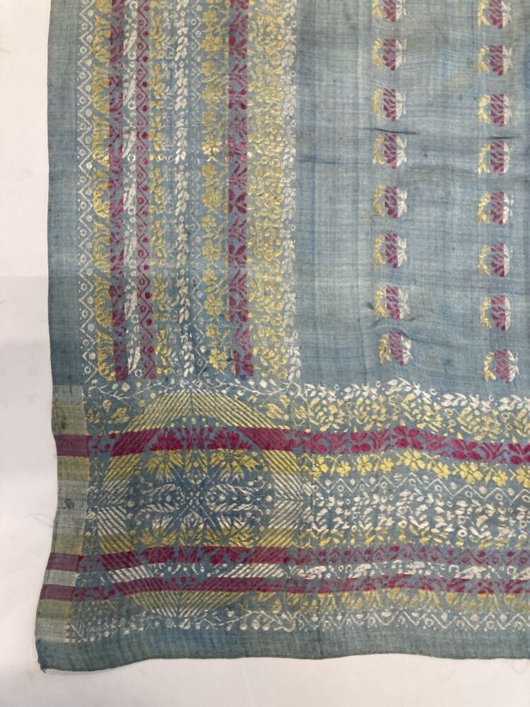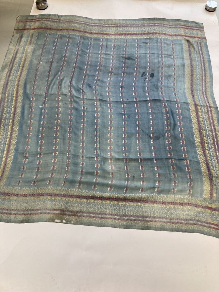 Zijden sjaal met kasjmiermotieven, randen rondom, butamotiefjes op lichtblauw fond