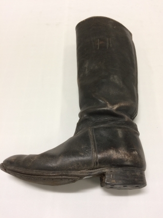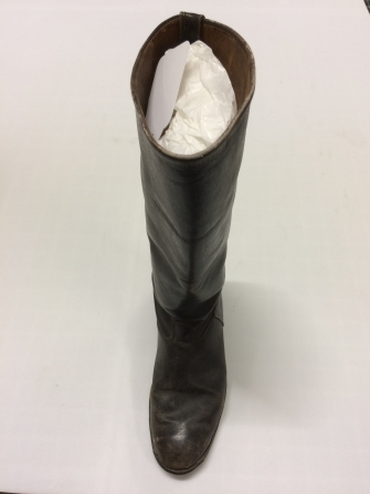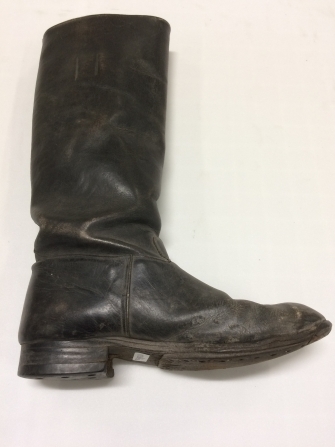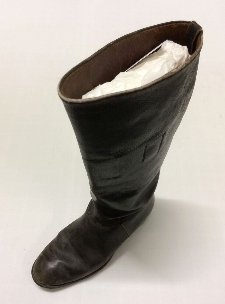 Linkerlaars, onderdeel van een paar paardrijlaarzen met rubberen hak