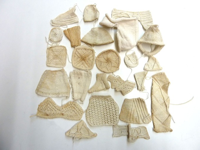 Zak met 24 proefstukjes breiwerk, zowel tricot als ajourbreiwerk