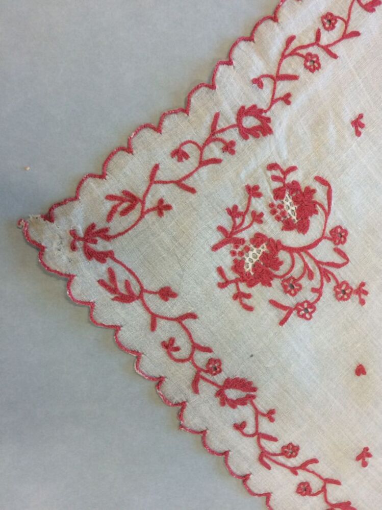 Neteldoek tipdoek met rood tamboereerwerk rand langs drie zijden