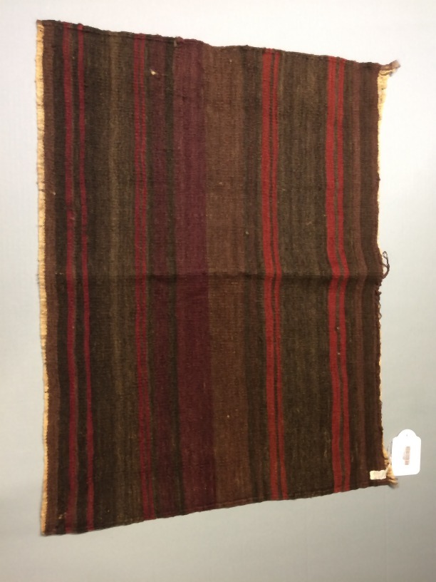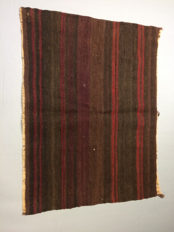 Deel van geweven wollen mat, bruin met rode strepen