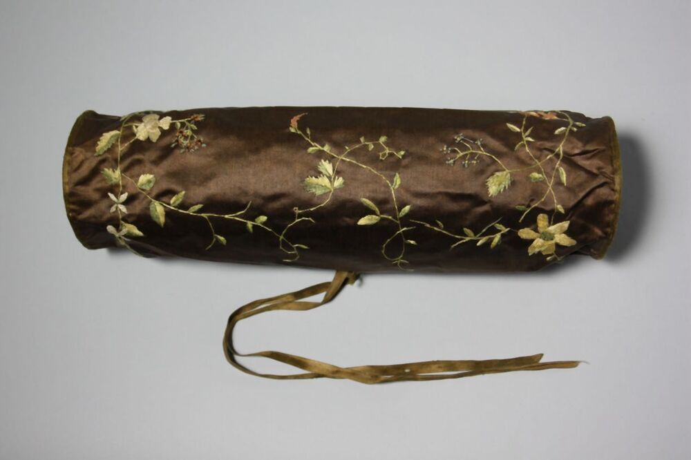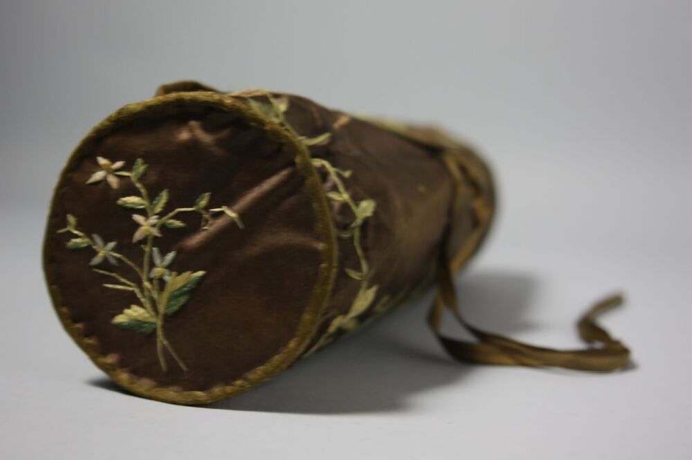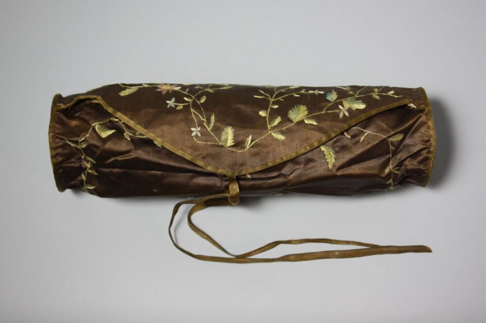 Bruin satijnen roltasje met striksluiting, versierd met geborduurde bloemen, voor breiwerk
