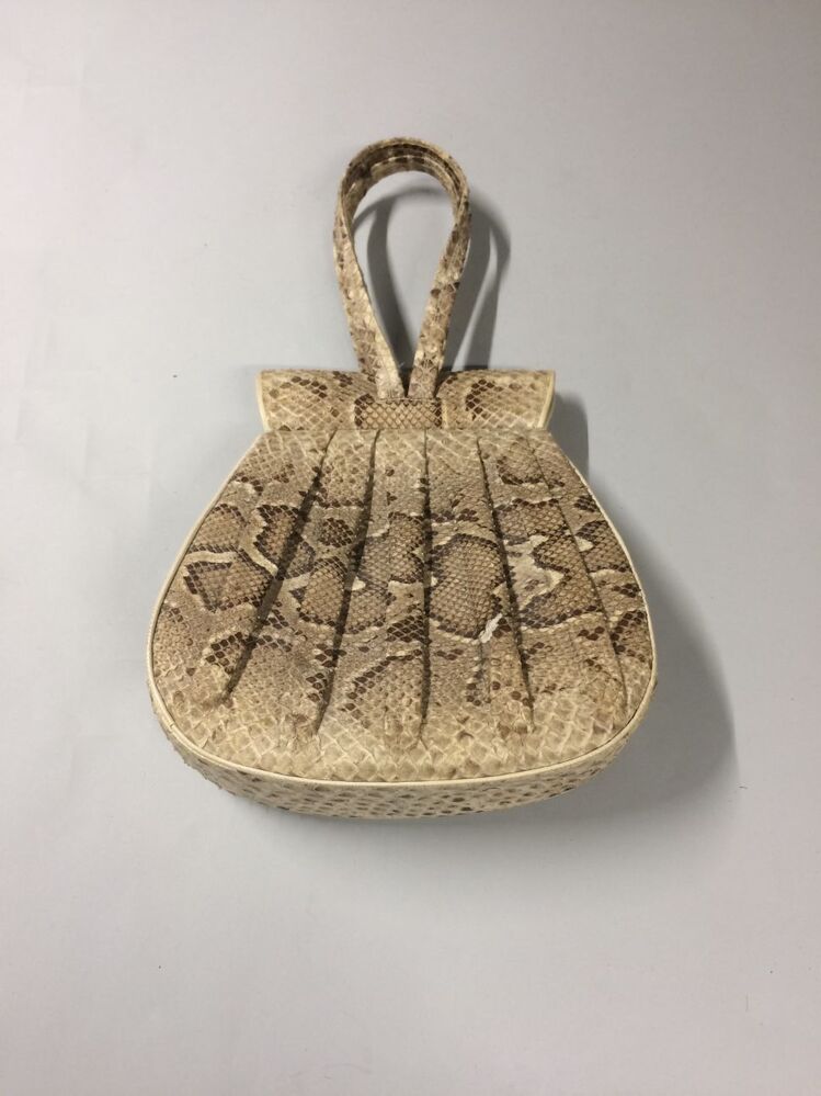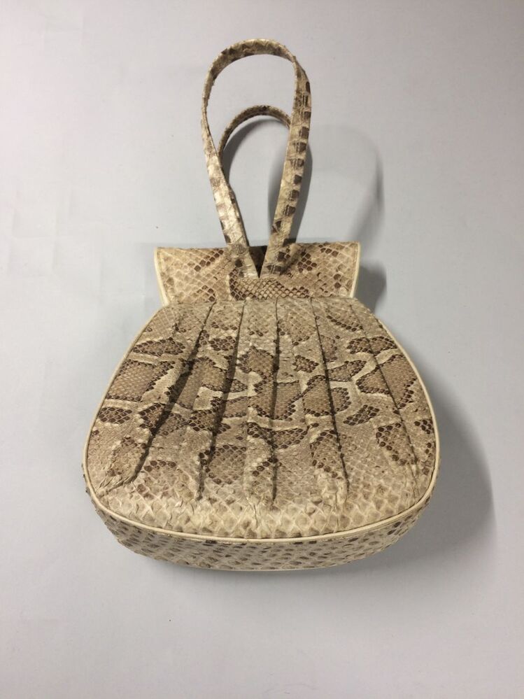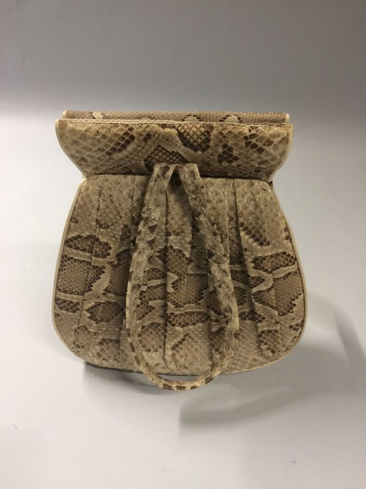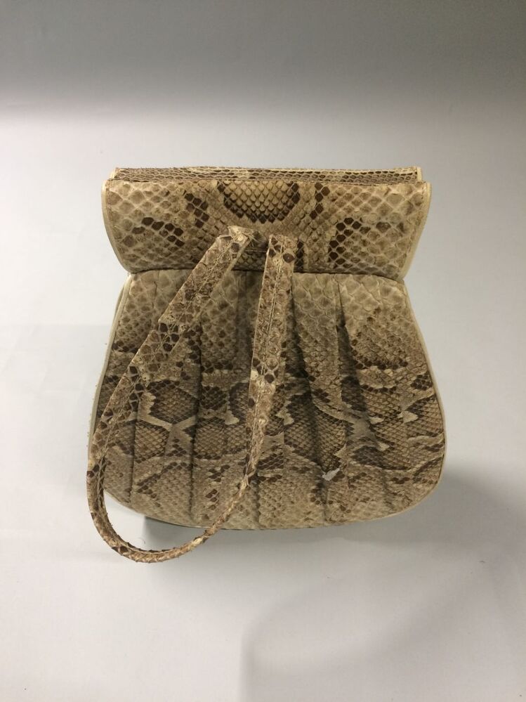 Beige-bruine geplooide slangenleren handtas met verborgen knipsluiting, gevoerd met leer