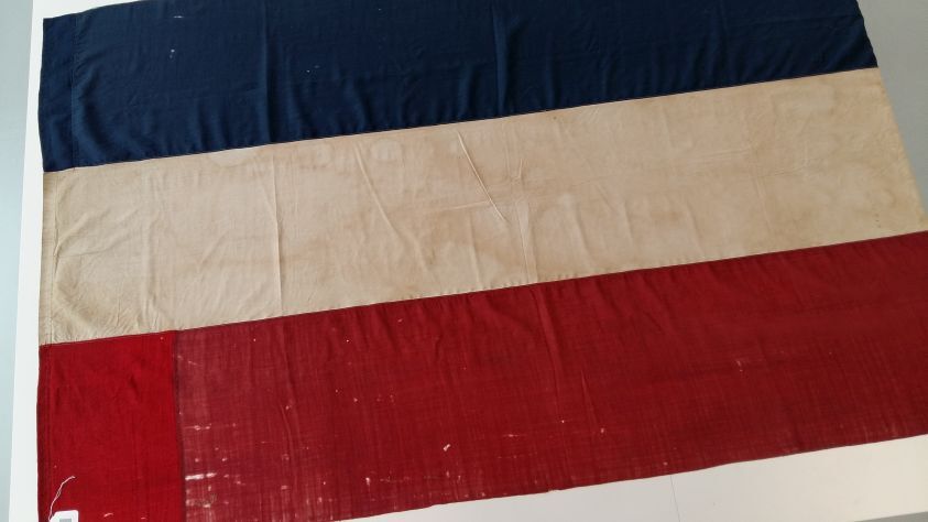 Rood, wit , blauwe vlag van rood en blauw wollen vlaggendoek en wit katoen, met touw en strikbandjes