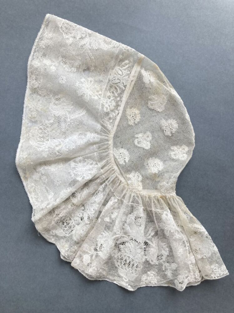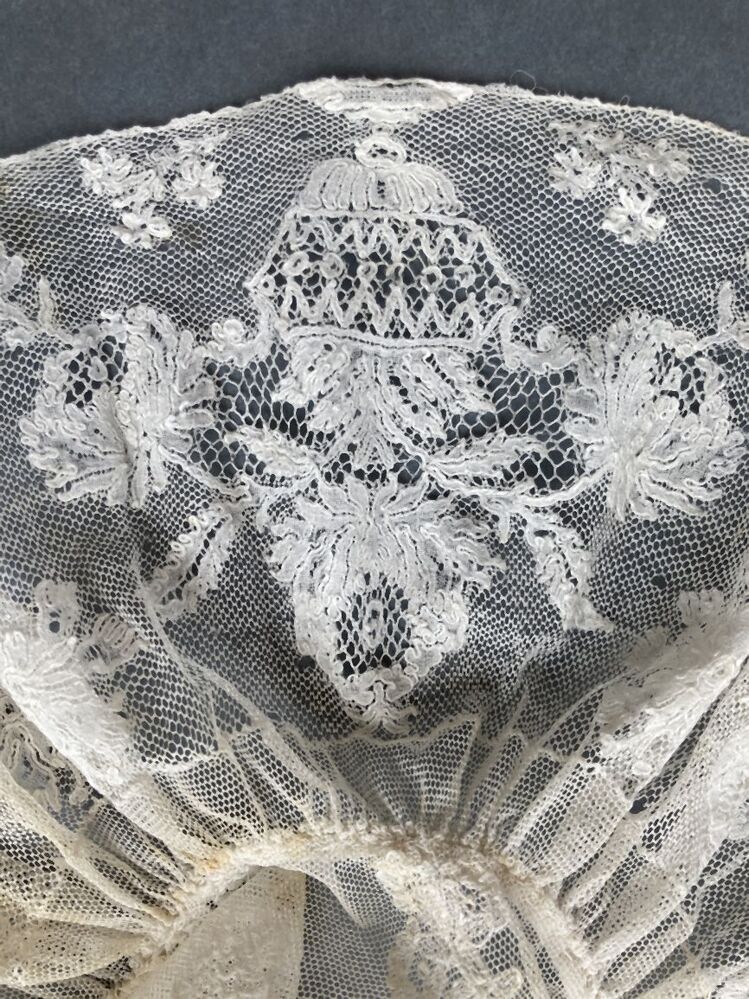 Slappe floddermuts van fijne Mechelse kloskant, doorgestopt motief in bol, strook van fijn bloempotmotief met pioenrozen