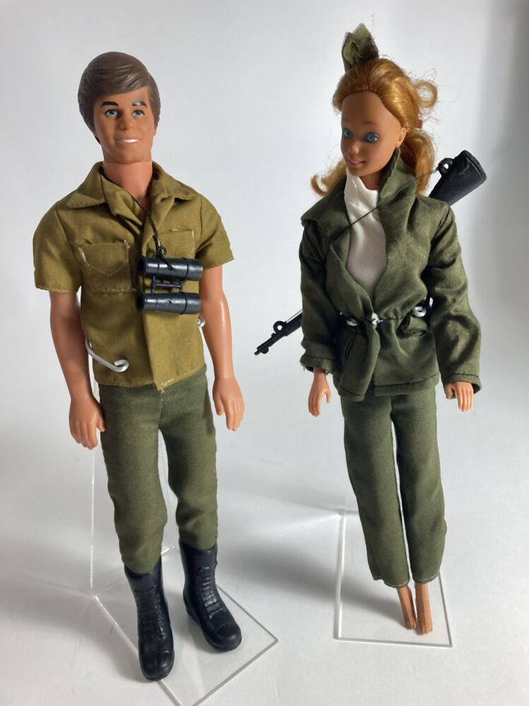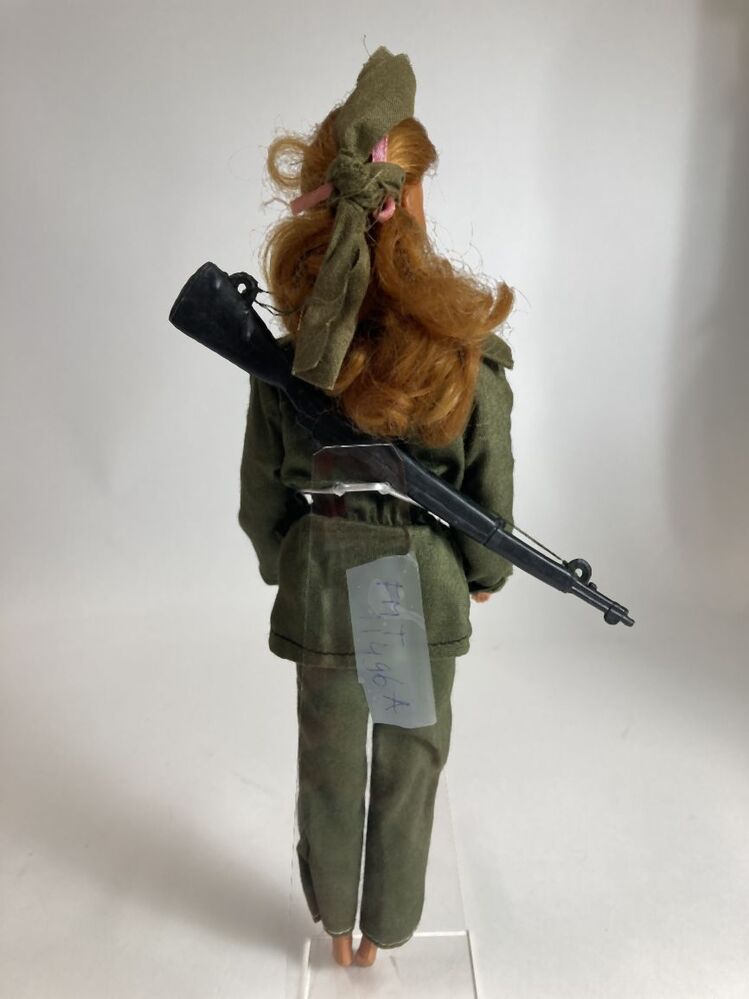 Barbiepop met rood lang haar in jachtkleding, wit truitje en groen jasje met groene broek, draagt een geweer, onderdeel van groep van twee