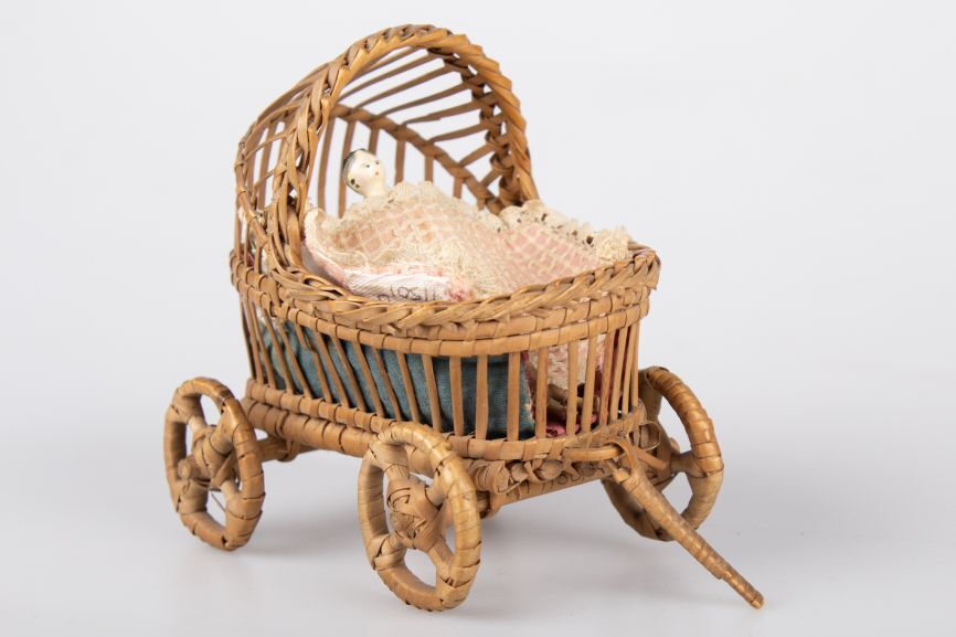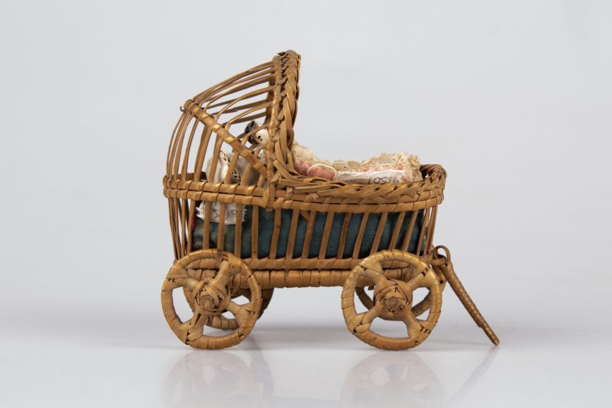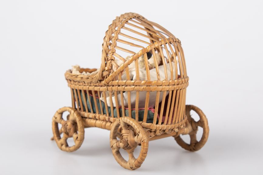 Rieten popenwagentje met bijbehorend beddengoed en houten popje in wit jurkje, onderdeel van groep van vijf