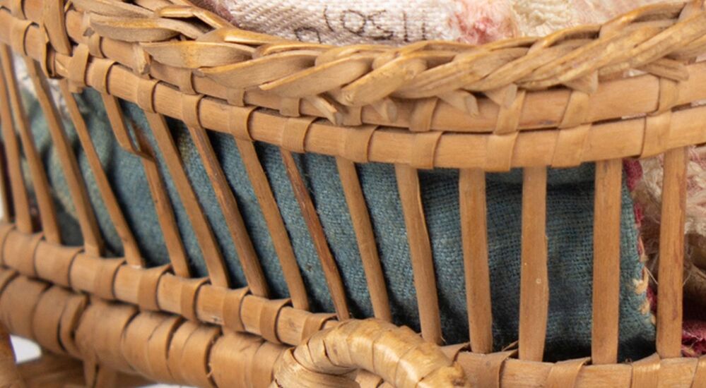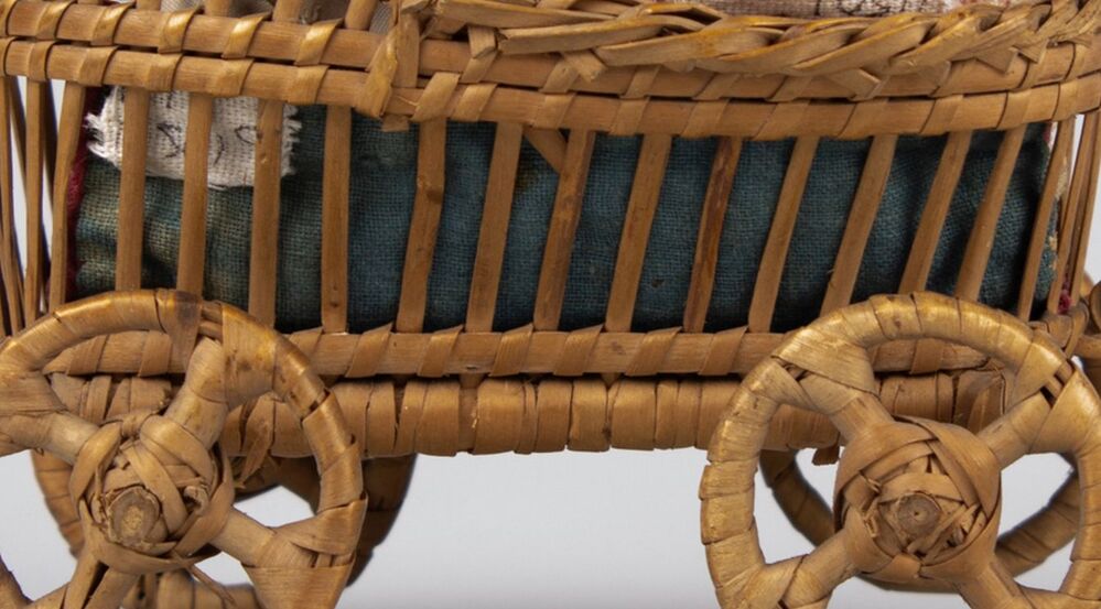 Poppendekentje horend bij popenwagentje met bijbehorend beddengoed en houten popje in wit jurkje, onderdeel van groep van vijf