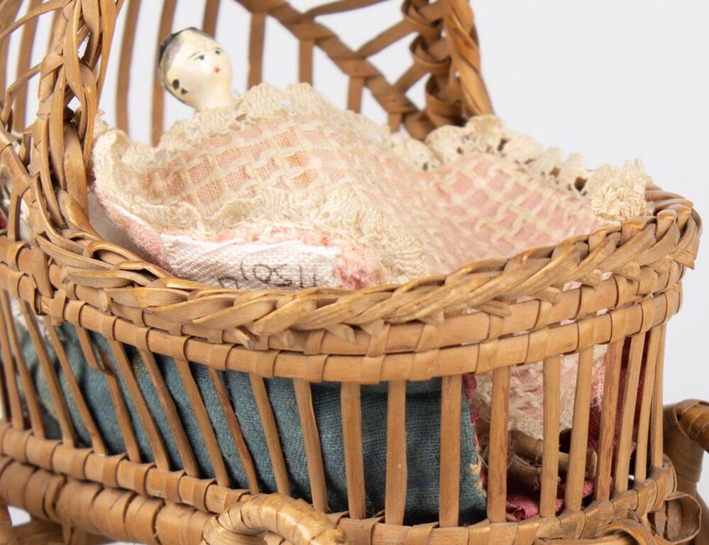 Houten poppetje horend bij popenwagentje met bijbehorend beddengoed, onderdeel van groep van vijf