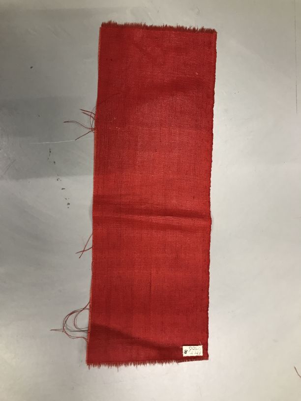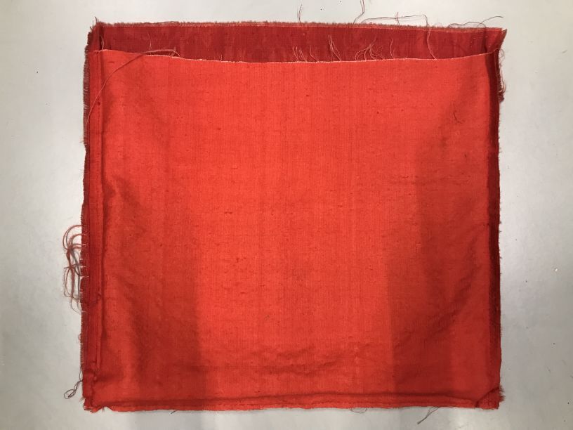 Kussenovertrek van tomaatrode mohair wollen velours en moiré-greinen onderkant, met losse lap grein