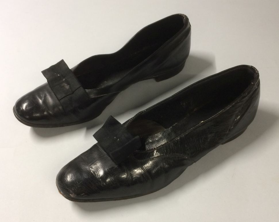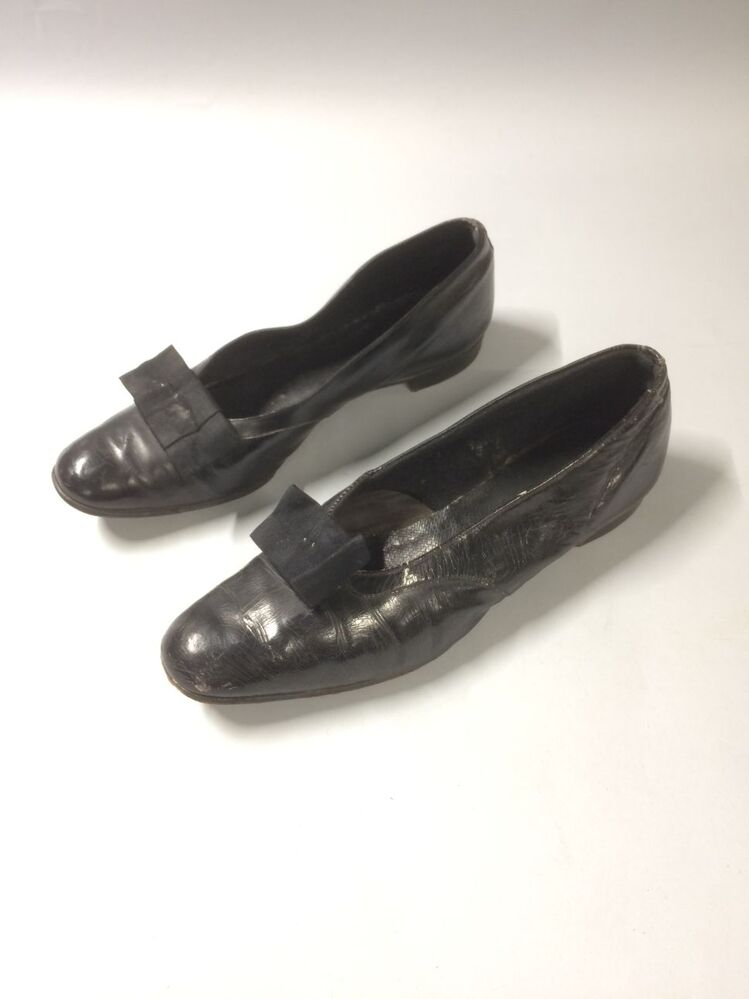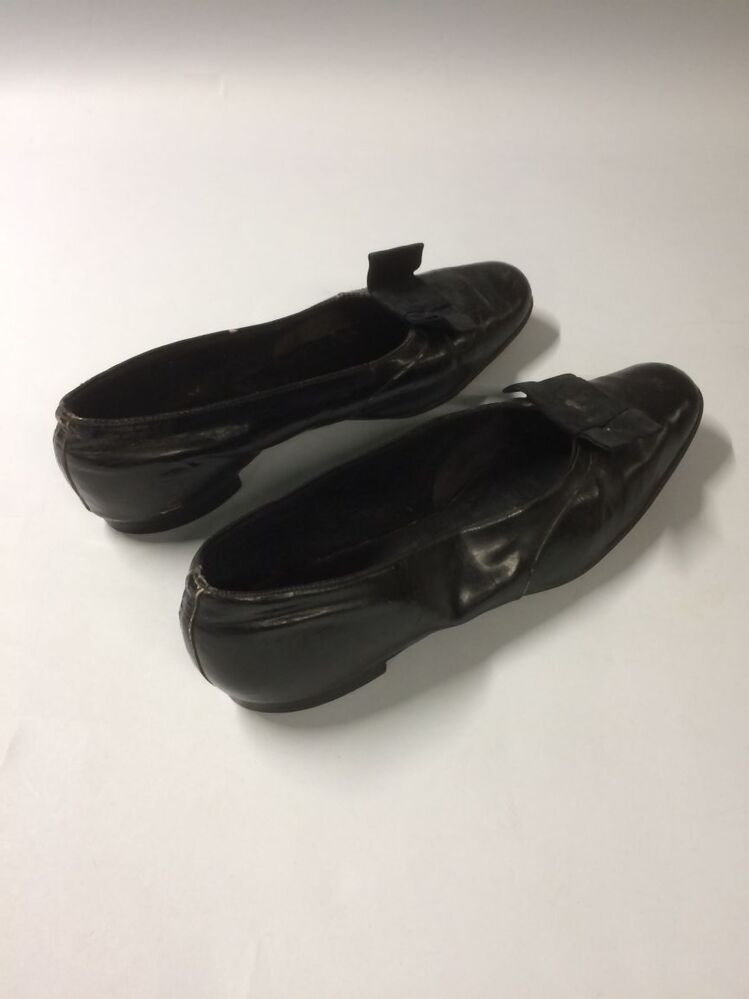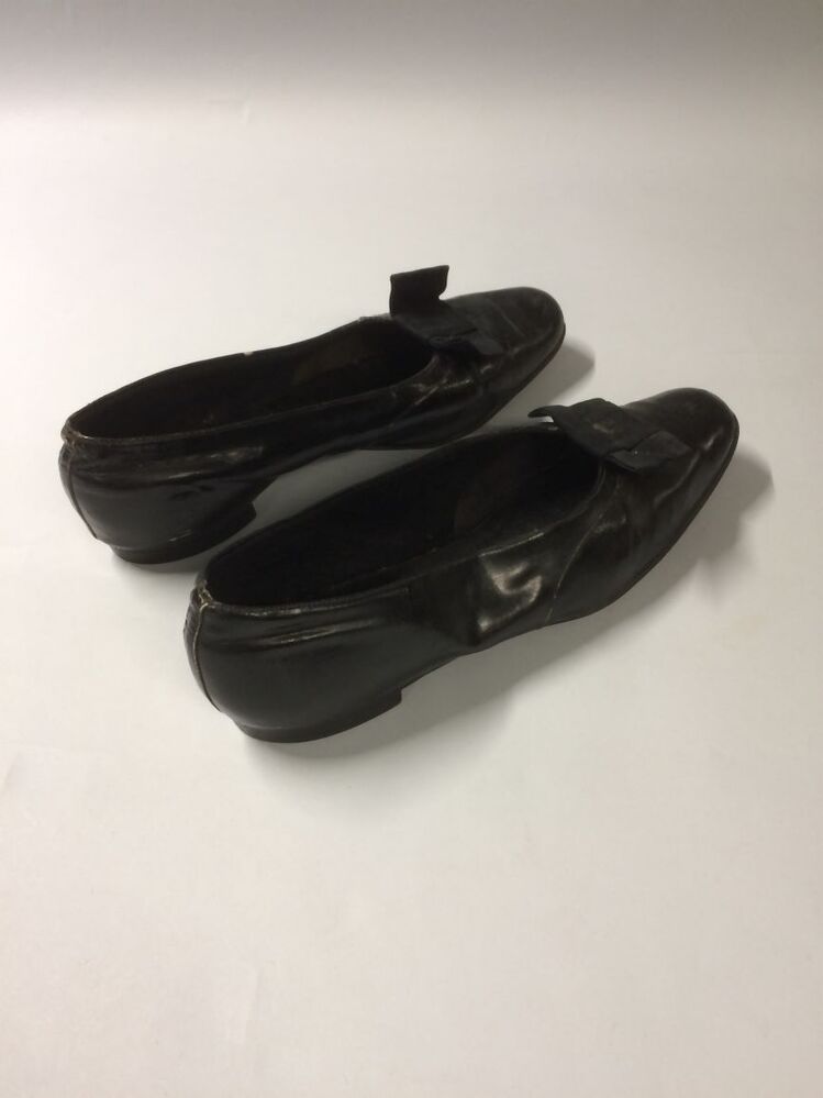 Paar zwarte leren lakschoenen met ribsband strikje op voorvoet, met platte hak