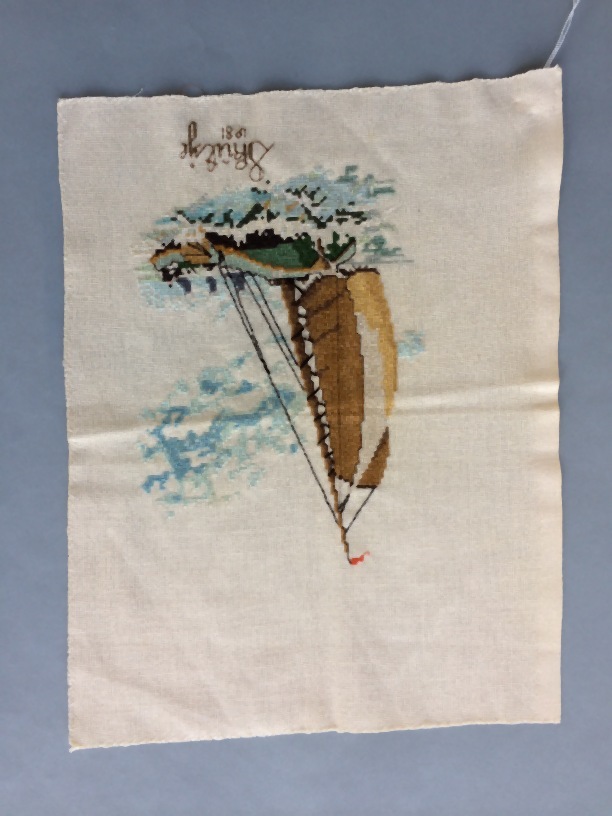 Borduurstuk in kruissteken met afbeelding van skûtsje zeilschip in de golven, met de tekst skûtsje 1981