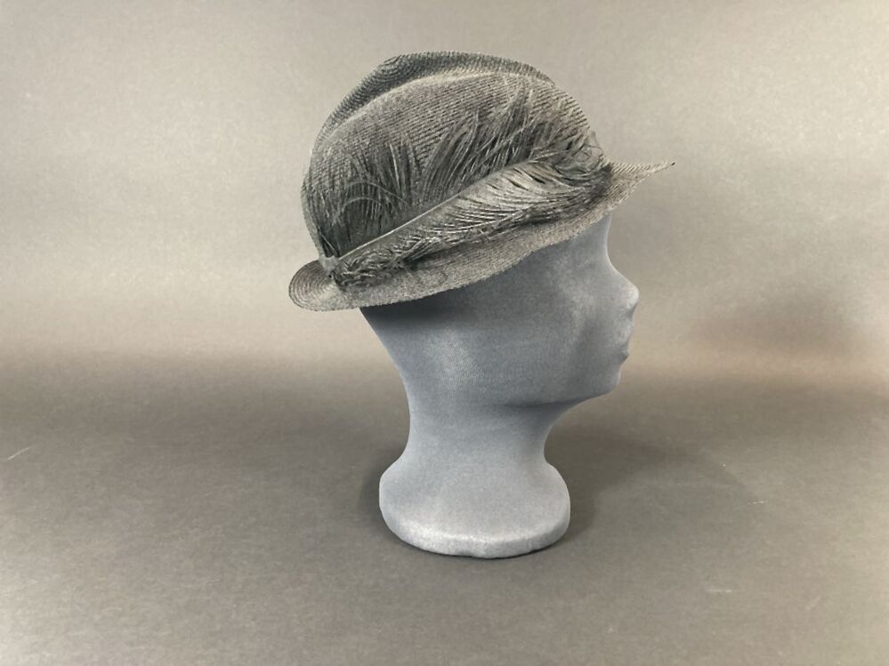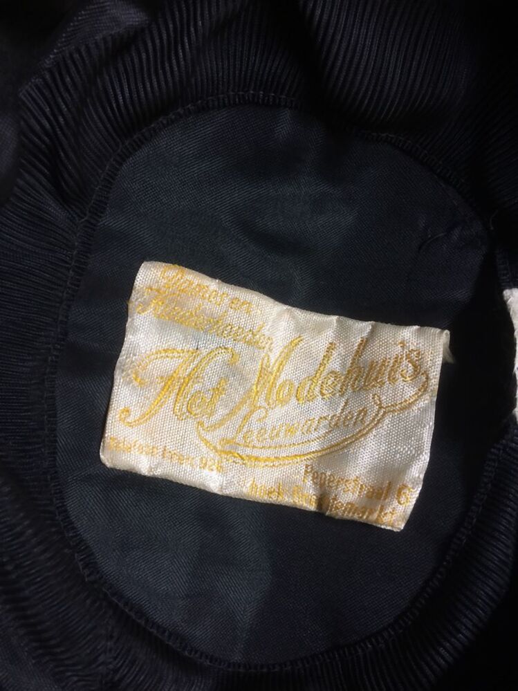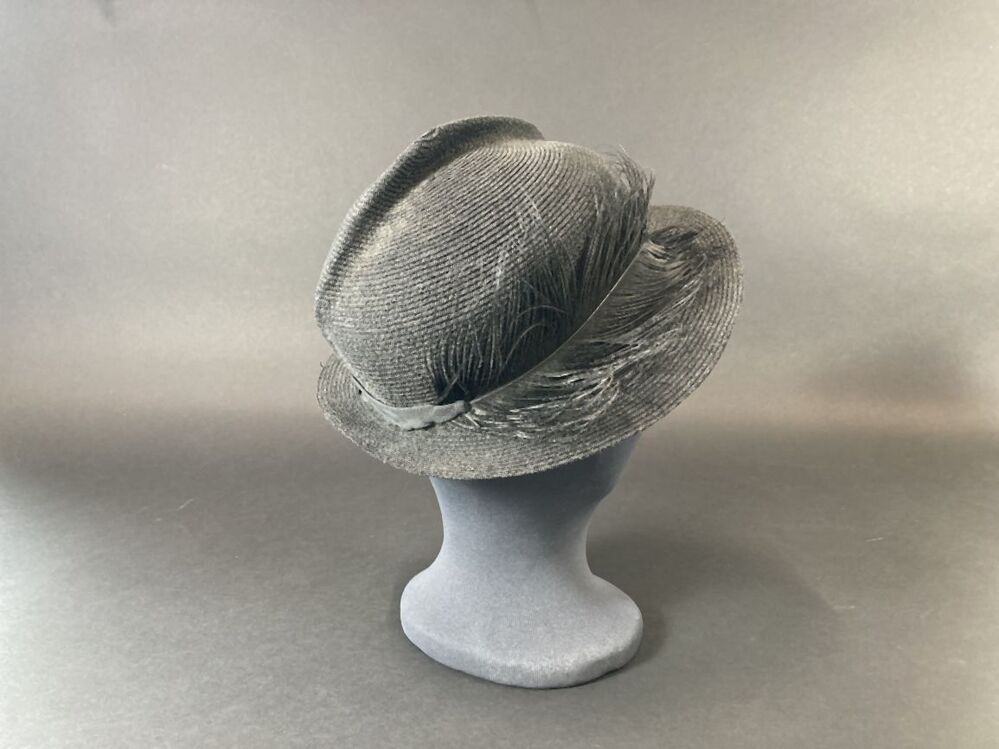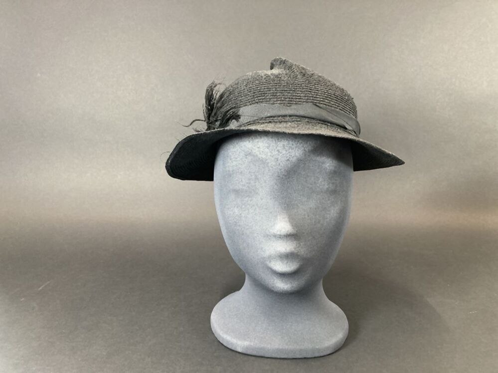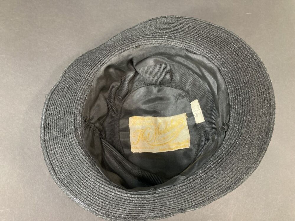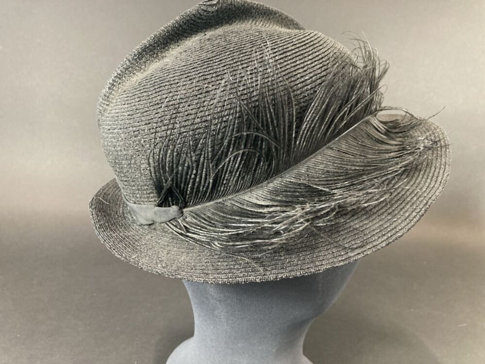 Zwart hoedje van fijn glanzend paardenhaar, band genaaid met vouw in de bol, smalle rand met struisveer
