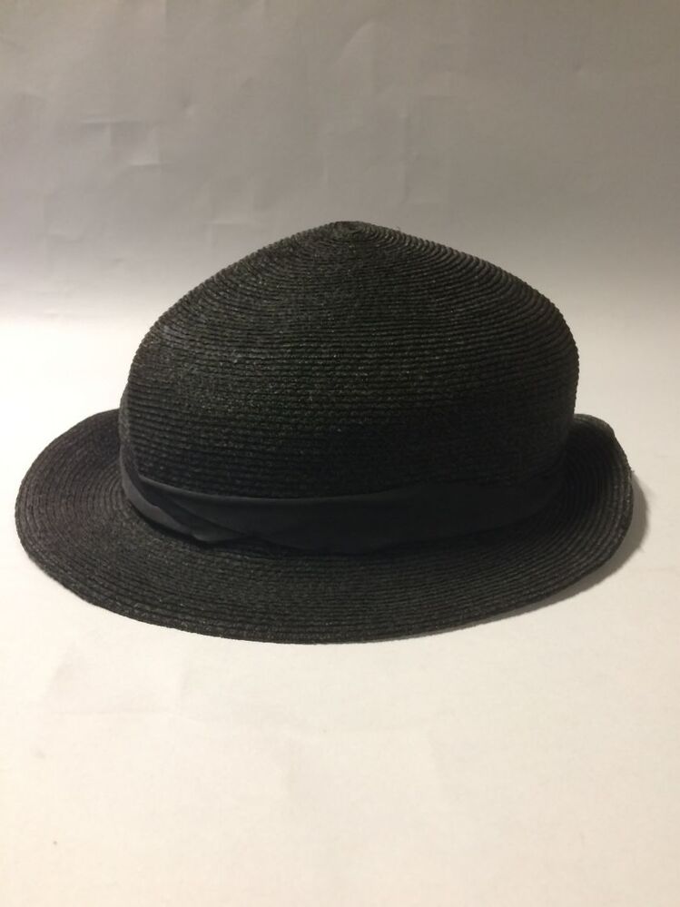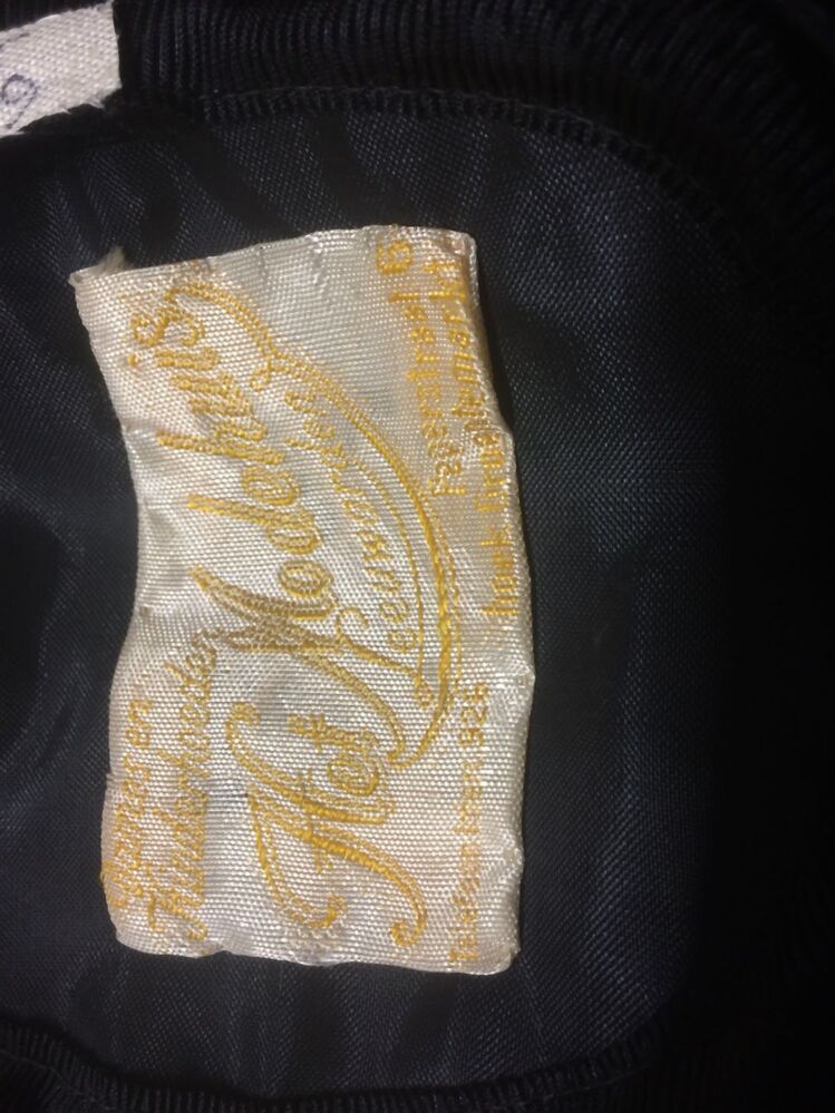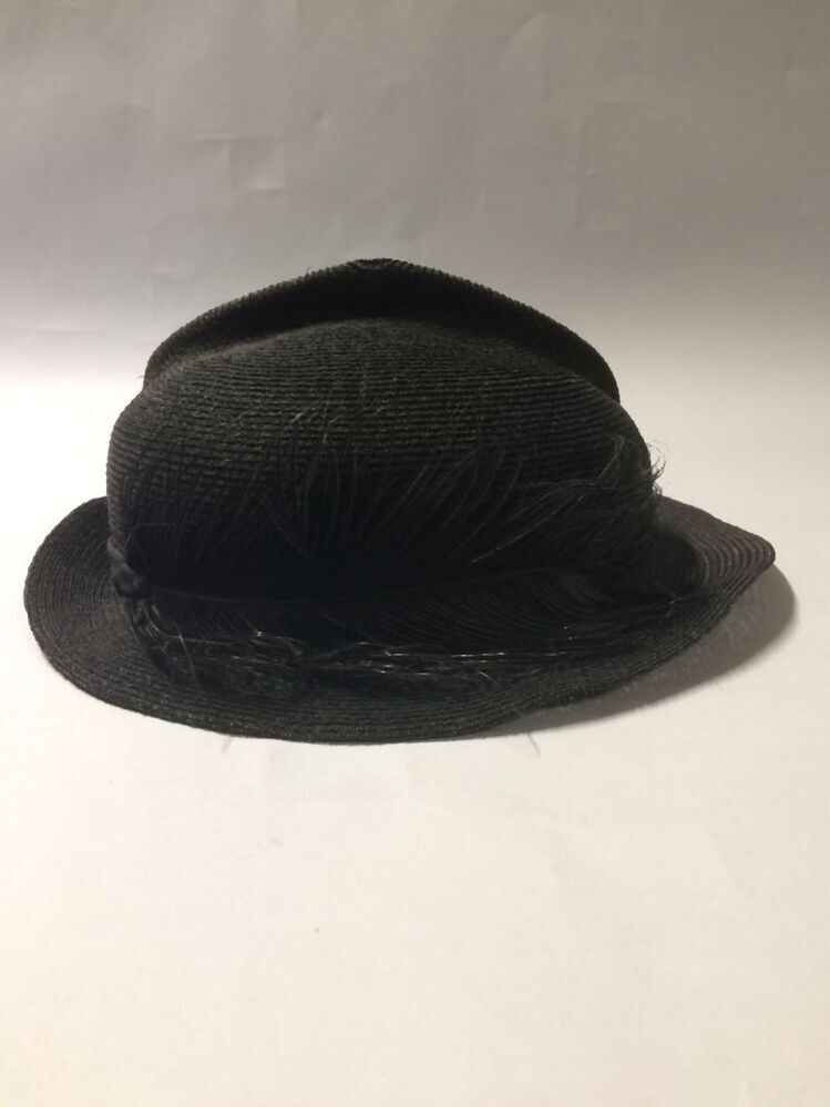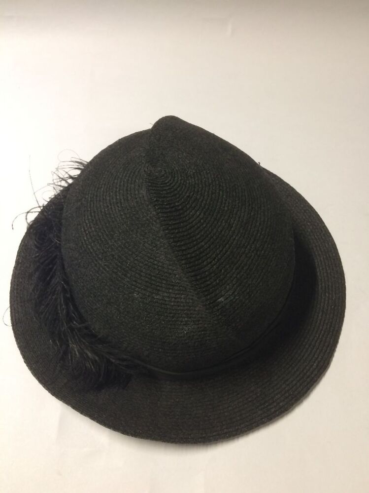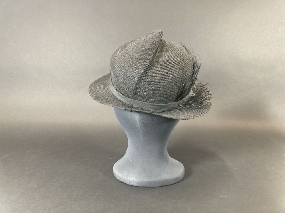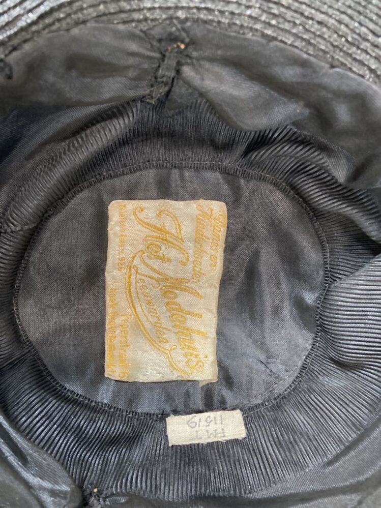 Zwart hoedje van fijn glanzend paardenhaar, band genaaid met vouw in de bol, smalle rand met struisveer