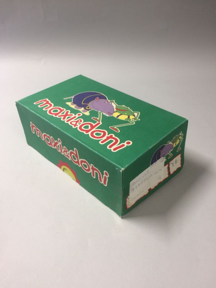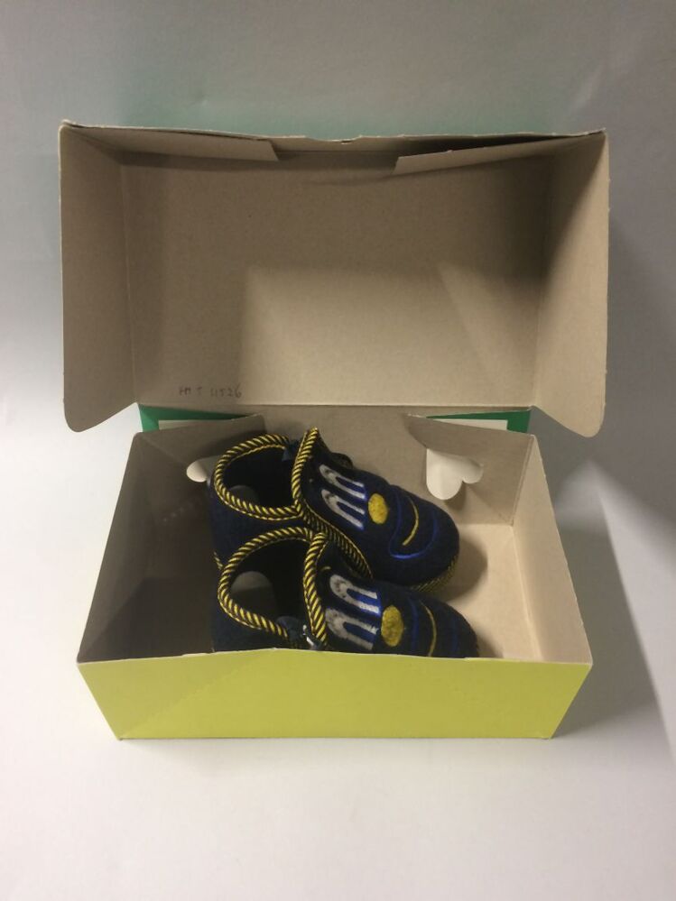 Originele doos horend bij een paar donkerblauwe fleece kinderpantoffels