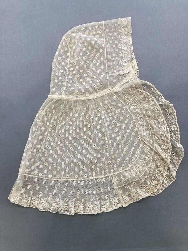 Sluiermuts van getamboereerde tule met kleine bloemetjes, strook afgezet met fijn tule kloskant met floraal motief