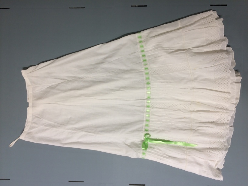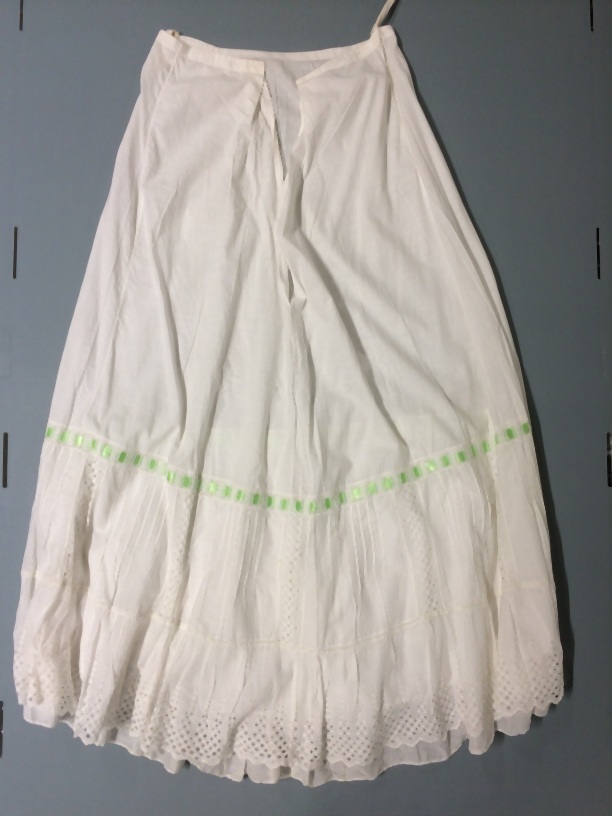 Gerende lange onderrok van fijn wit katoen met brede strook langs de zoom met naaldplooien en machinaal broderie, geometrisch patroon, gemerkt WD in witte kruissteken