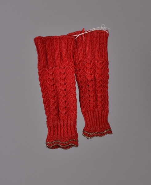 Paar lange mouwen gebreid in ajoursteek van rood katoen met zilvergaren bij de pols, onderdeel van groep van twee