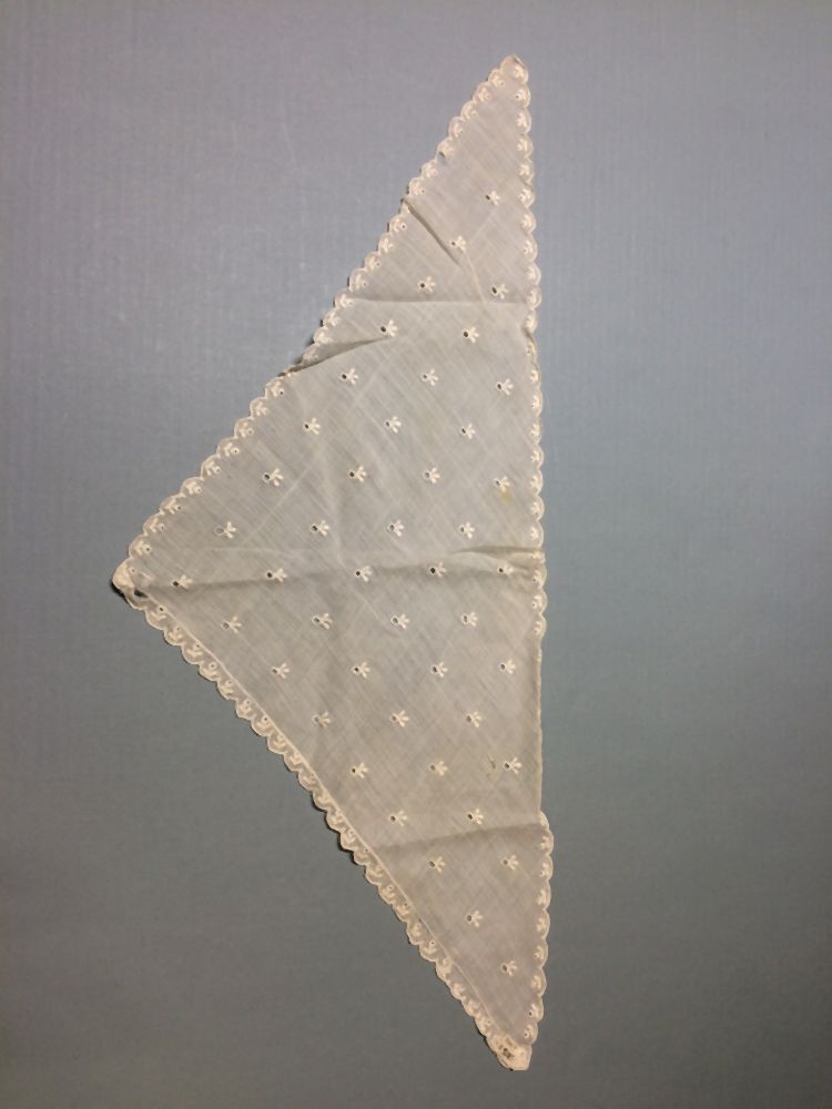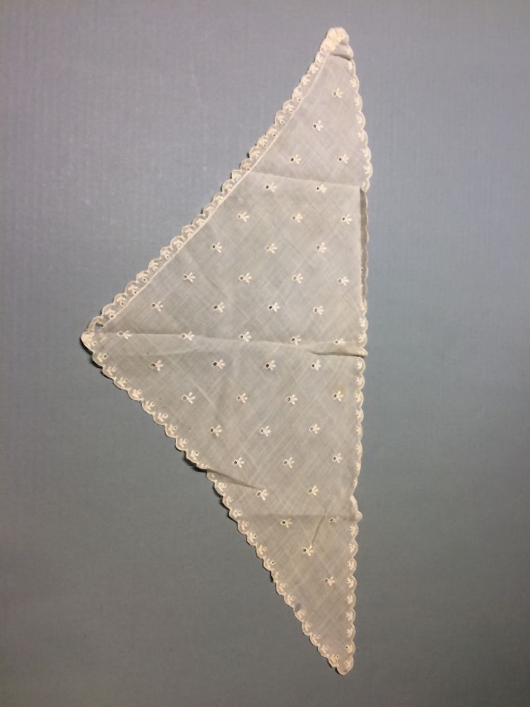 Driekante halsdoek of tipdoek voor pop gemaakt uit een grote tipdoek van wit transparant neteldoek met wit borduurwerk