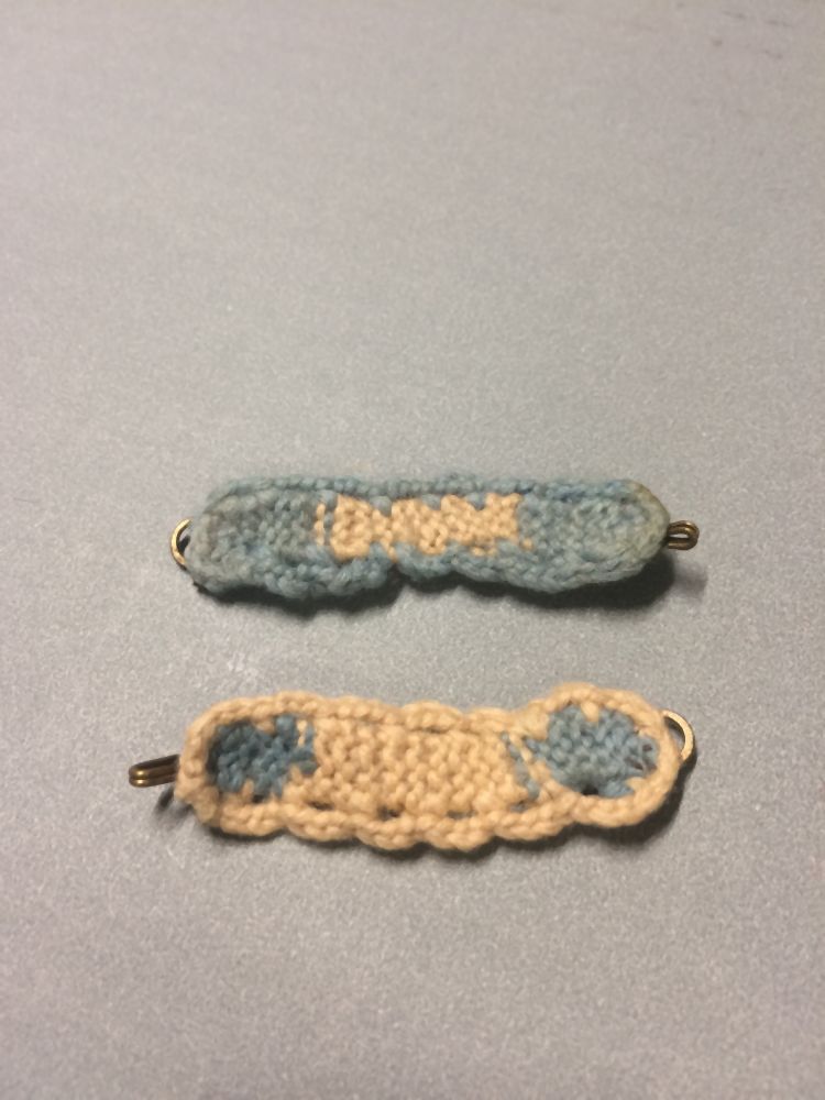 Paar gebreide kousenbanden van lichtblauwe en witte wol, uit doosje poppenkleding