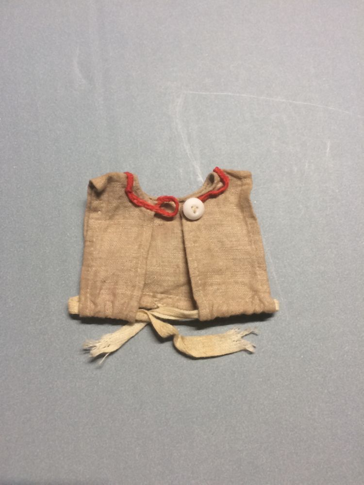 Kroplap van beige linnen met rood biesje, uit doosje poppenkleding