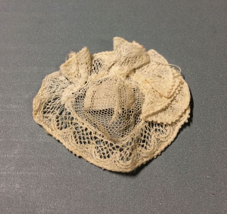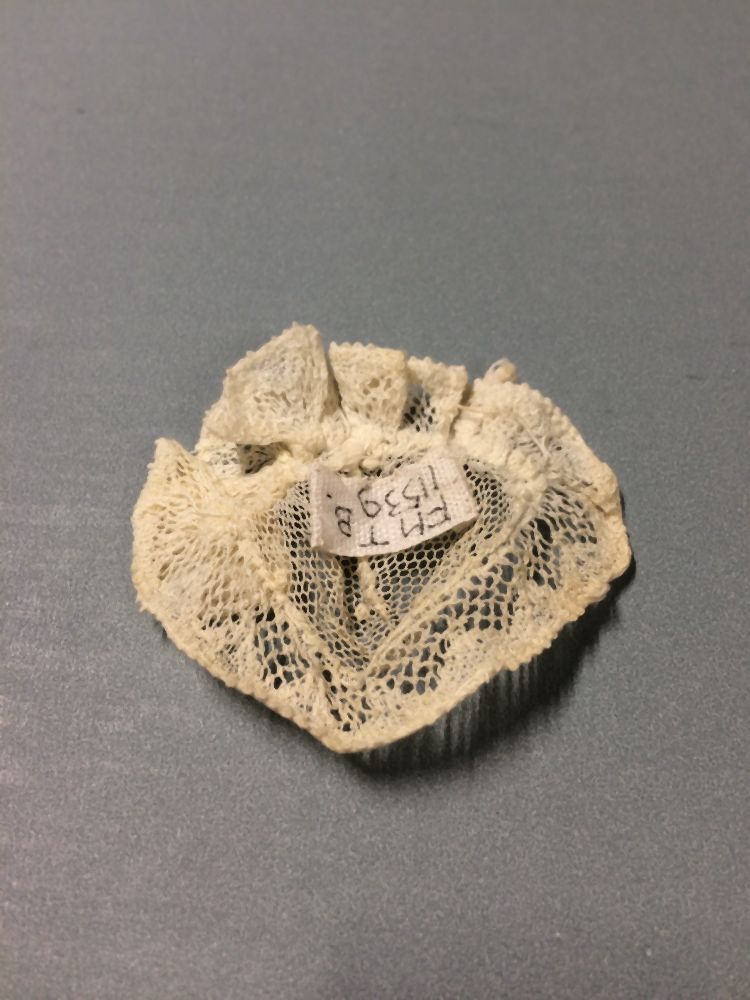 Floddermuts van tule met machinaal kloskant strook, onderdeel van groep van twee