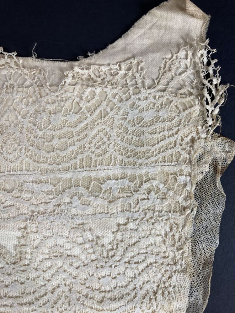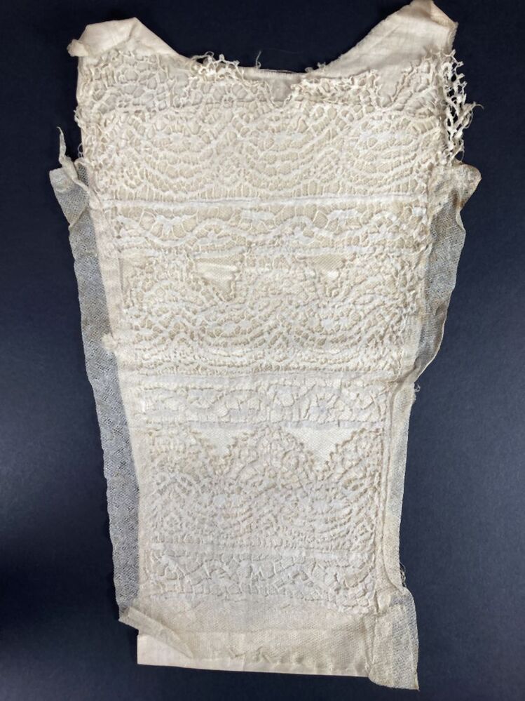 Cremekleurige bef of inzetfront van kloskantapplicatie op tule met satijnen tussenvoering voor jak of japon