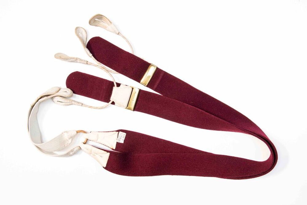 Verstelbare bretels van wijnrood wollen laken met wit leren riempjes met knoopsgaten, midden achter verbonden door elastiek