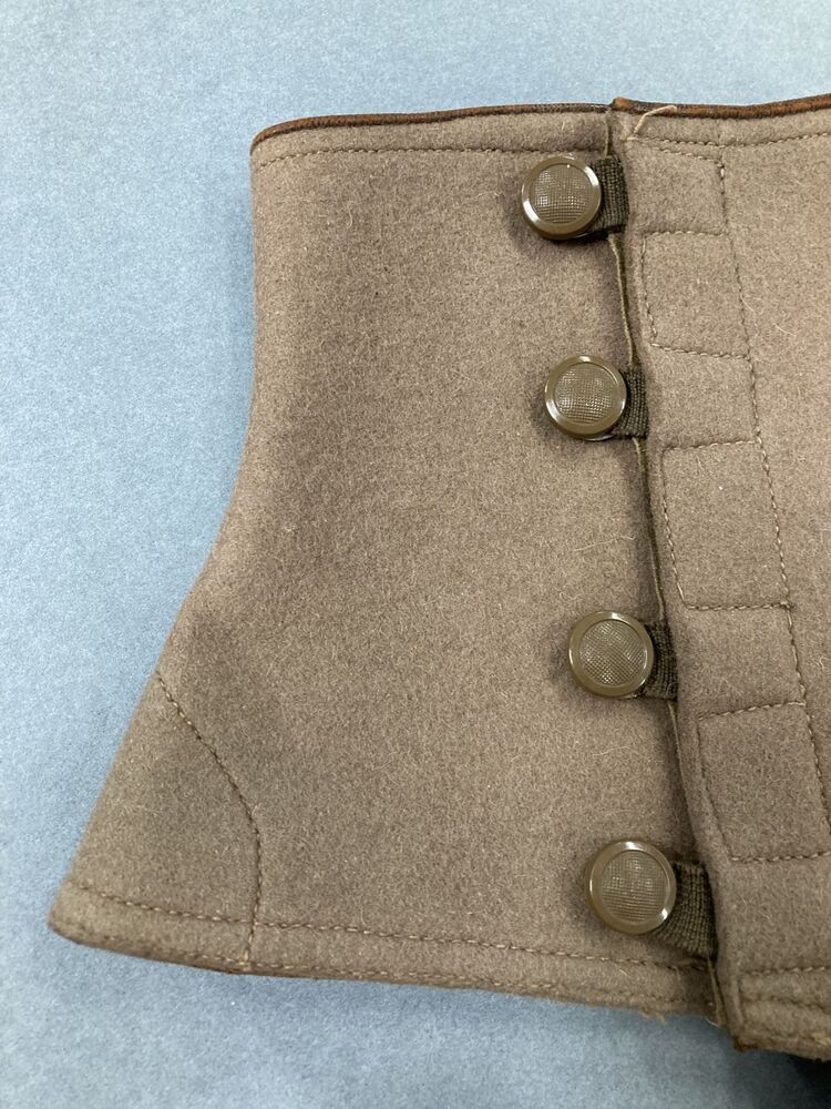 Paar korte slobkouwen van beige wollen laken met vier drukknopen en bandje onder de voet, afgewerkt met leer