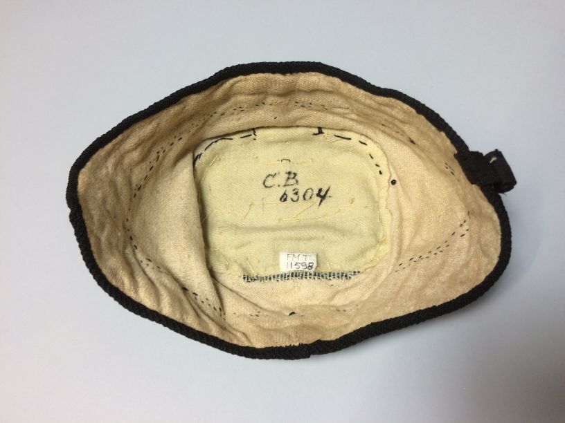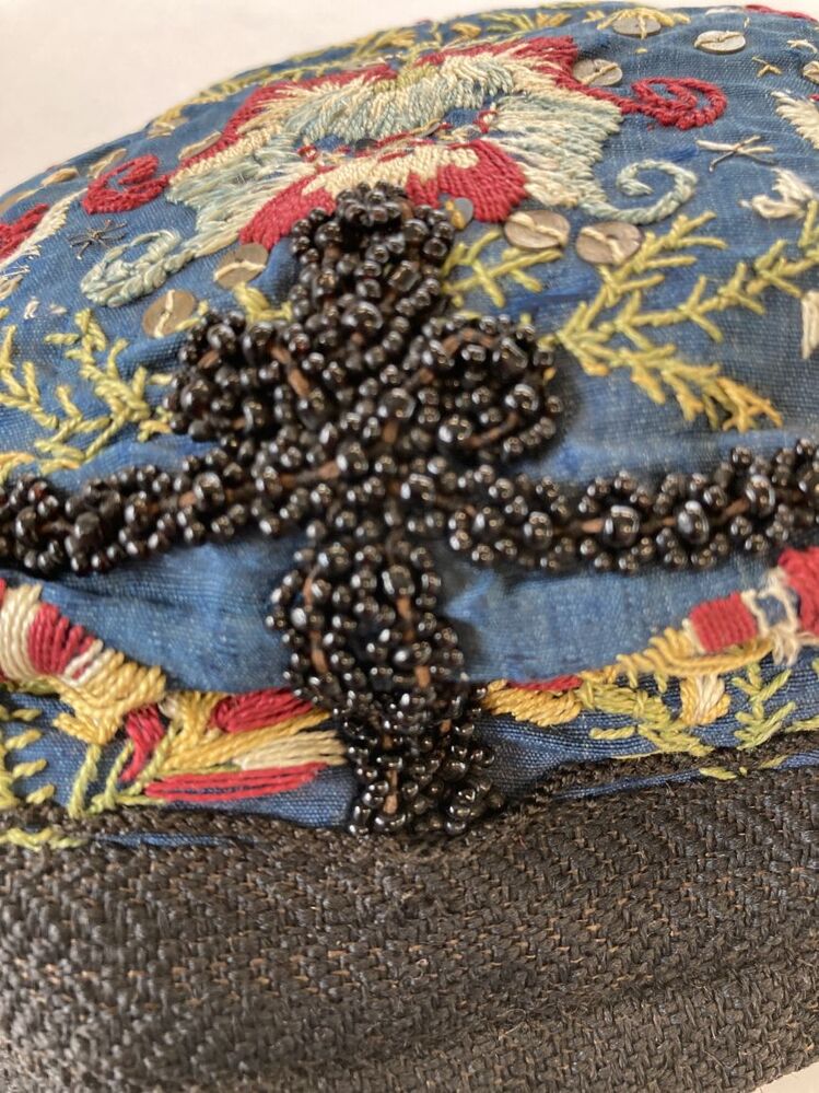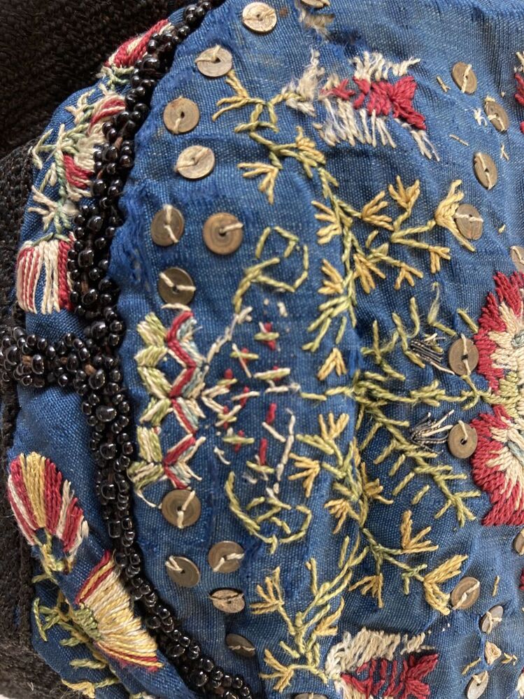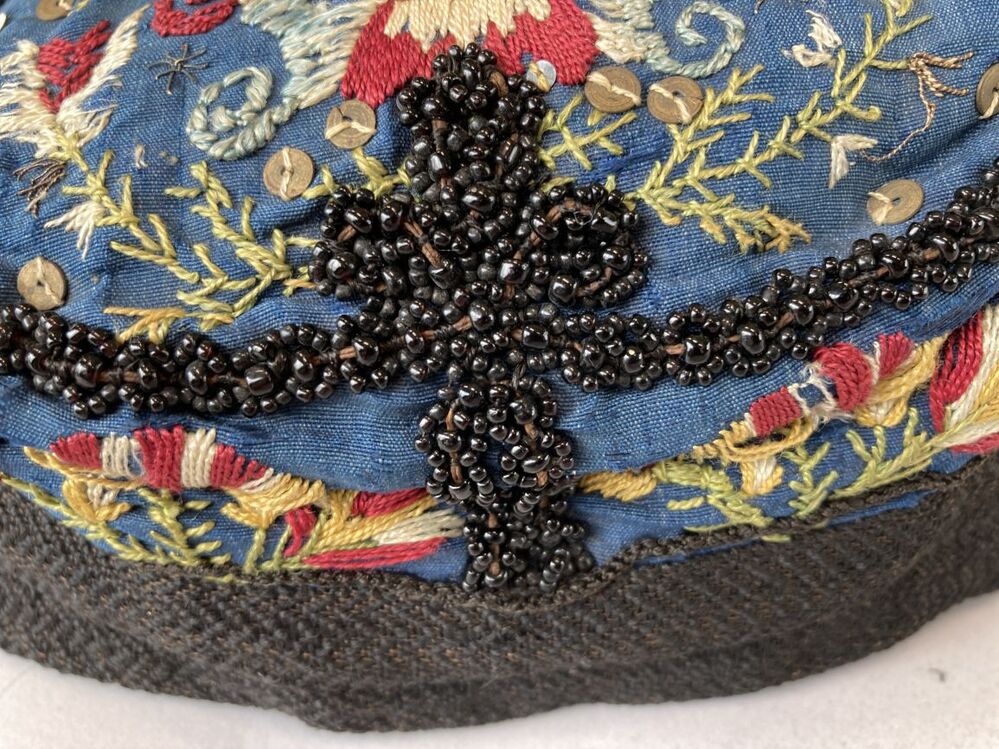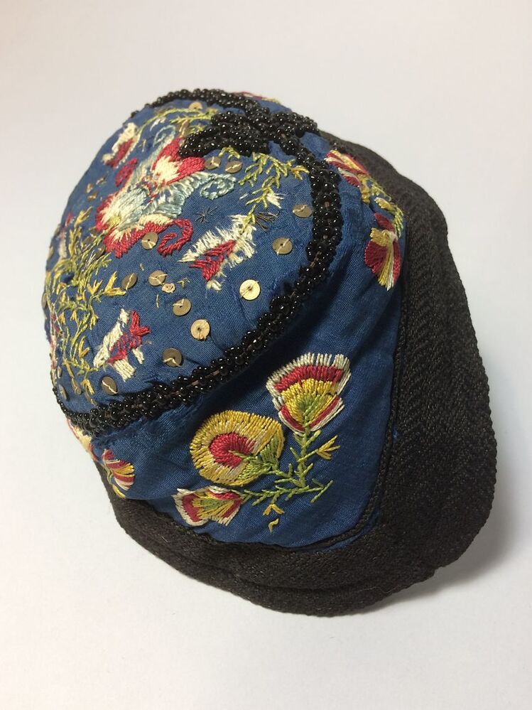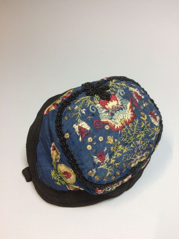 Blauw zijden 'klappe', Hindelooper meisjesmuts, met veelkleurig borduursel, afgezet met zwart wollen tresband en zwart kralenband