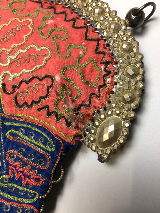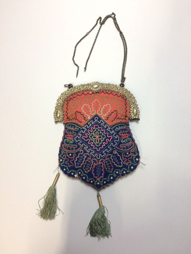 Beugeltas met zilveren beugel en ketting, blauw met rode tas met veelkleurig tamboereerwerk
