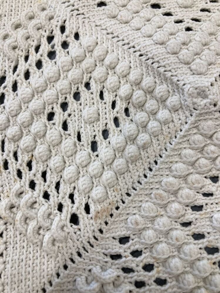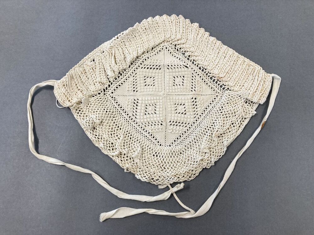 Witte morgenmuts, gehaakt met reliëf en hanekam
