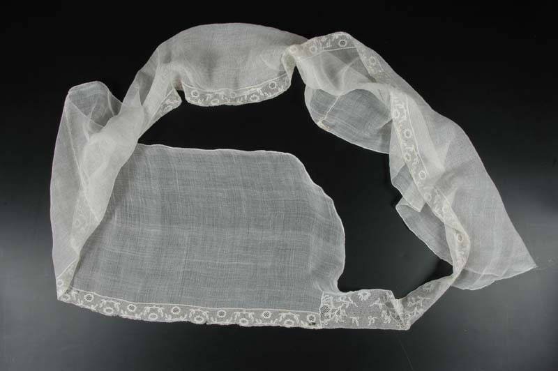 Lange strook van gaasweefsel, met aan één zijde een rand Point de Paris met bloemen, hoort oorspronkelijk bij sluiermuts