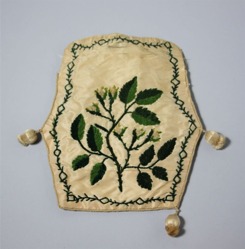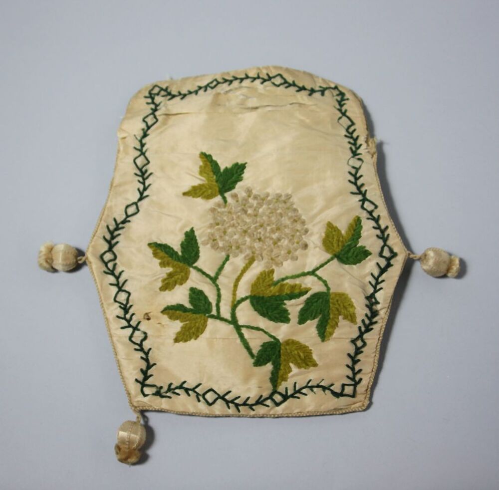 Crème zijden buideltas met chenille, borduurwerk met een hortensia aan één kant en tak met rozenknopjes aan de andere